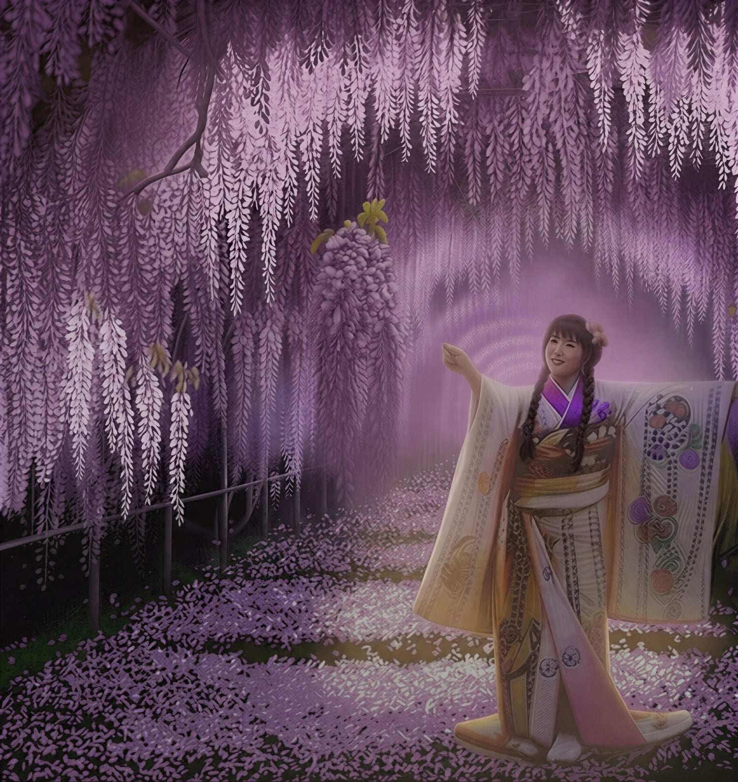 紫の幻想的な大藤の下で舞う「藤娘」。