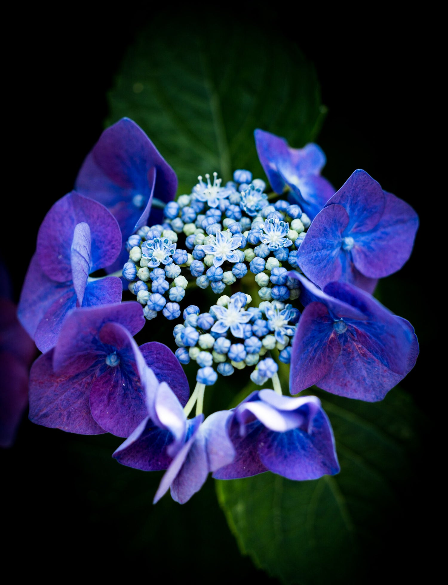 暗闇の中に浮かび上がる、一輪の紫陽花をクローズアップした写真です。周囲を彩る濃い紫色の花弁が、中央に集まる淡い青色の小さな蕾と花々を包み込んでいます。