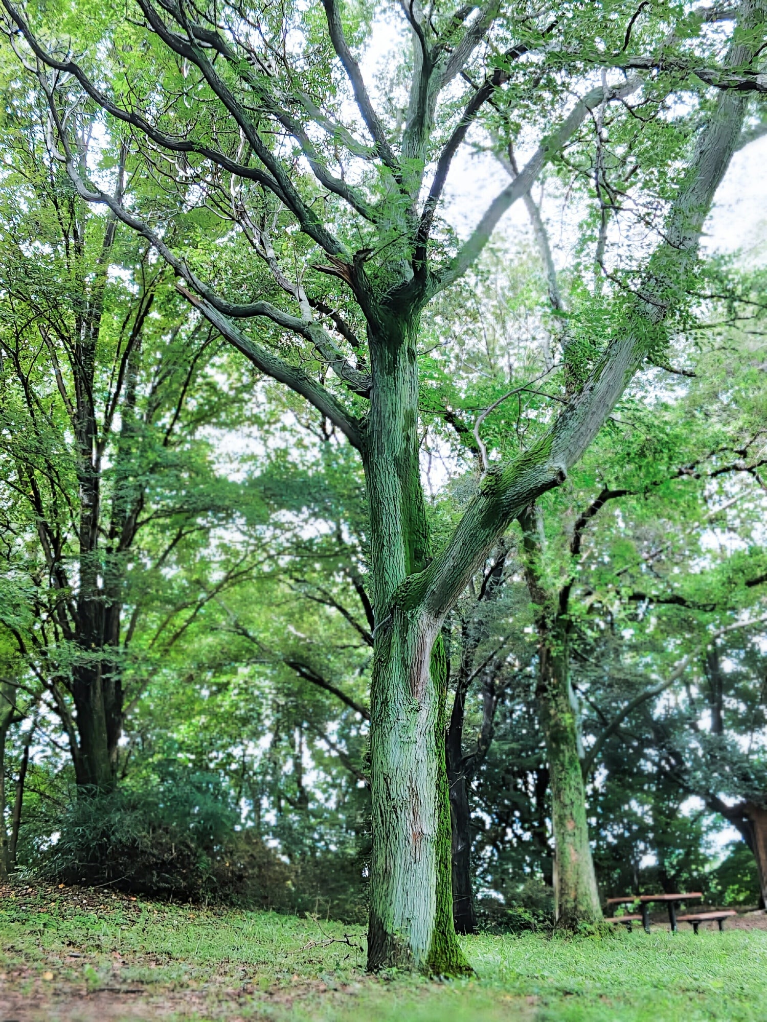 この写真は、緑豊かな公園の奥深く、長い年月を経て風格を湛えた一本のエノキ(Celtis sinensis)の堂々たる姿を捉えた1枚です。