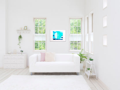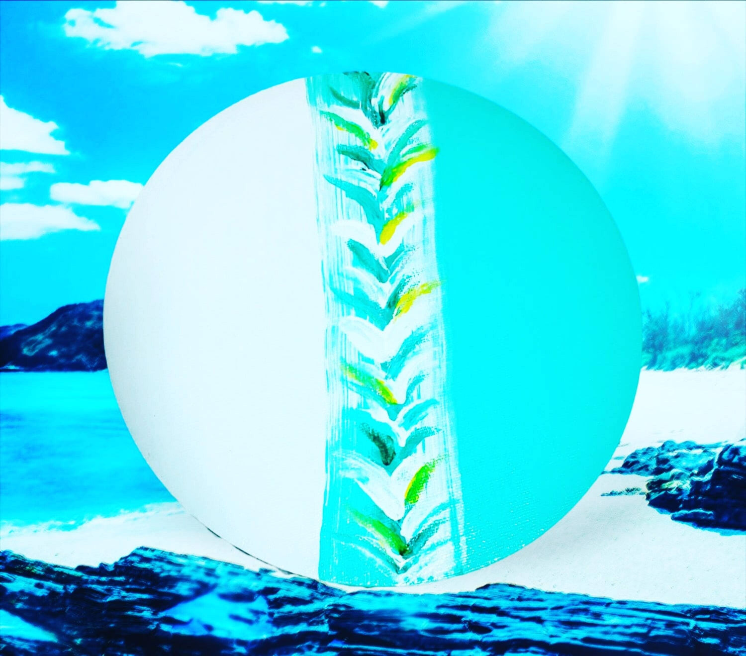 白とティファニーカラーとも呼ばれる淡いグリーンを半分ずつに塗りお互いを重ねるように反対側へひと塗りしています。美しい透明感のある作品になり、癒やされます。フラットな感情で観て頂けると感じています、真ん中は 伸びやかに平和のシンボルとして葉を描いています。8つの黄色は永遠と意味を重ねています、背景を写真加工で合わせている作品になります。好きな曲と観てみて頂きたいです
