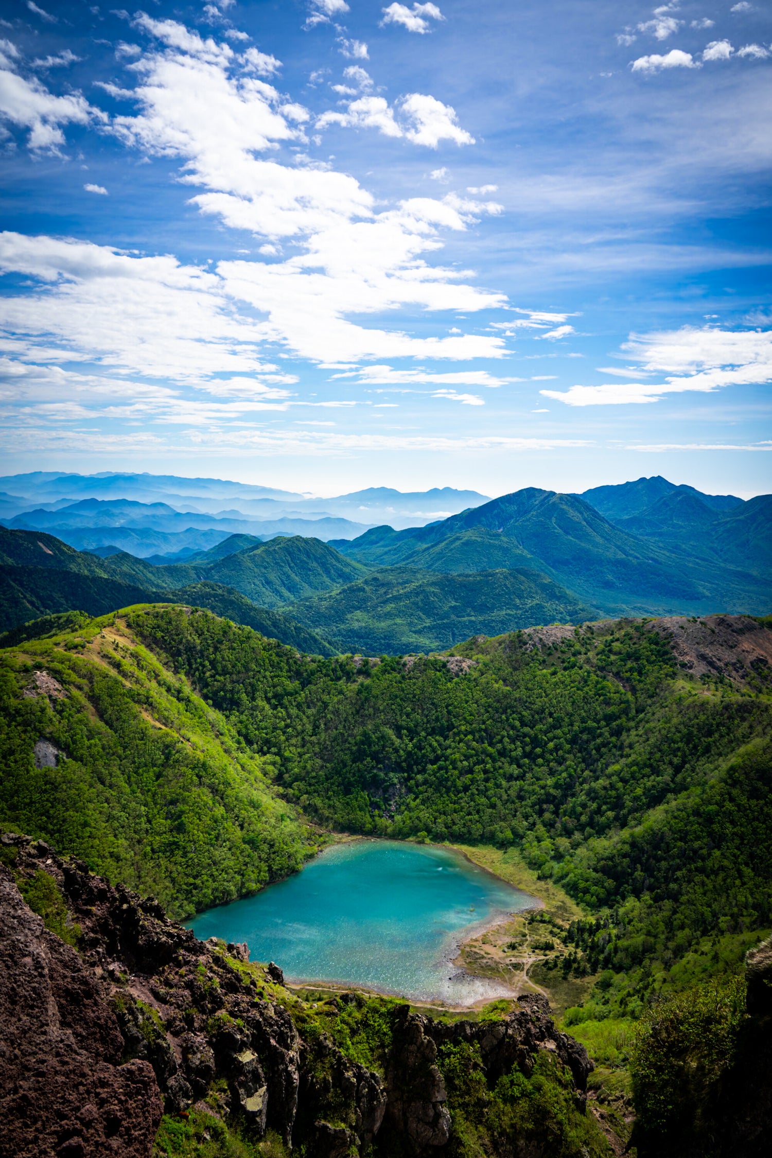 日光白根山から見下ろした、神秘的な湖と連なる山々の風景を捉えています。