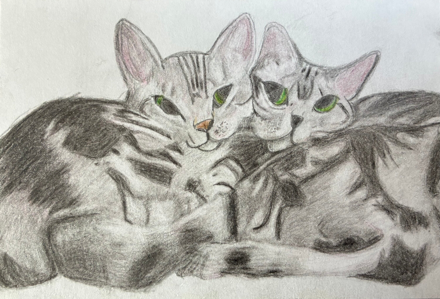兄弟ねこちゃんが、仲良く並んでいるところを、色鉛筆で描きました。