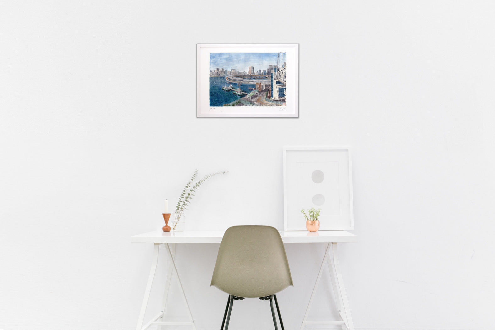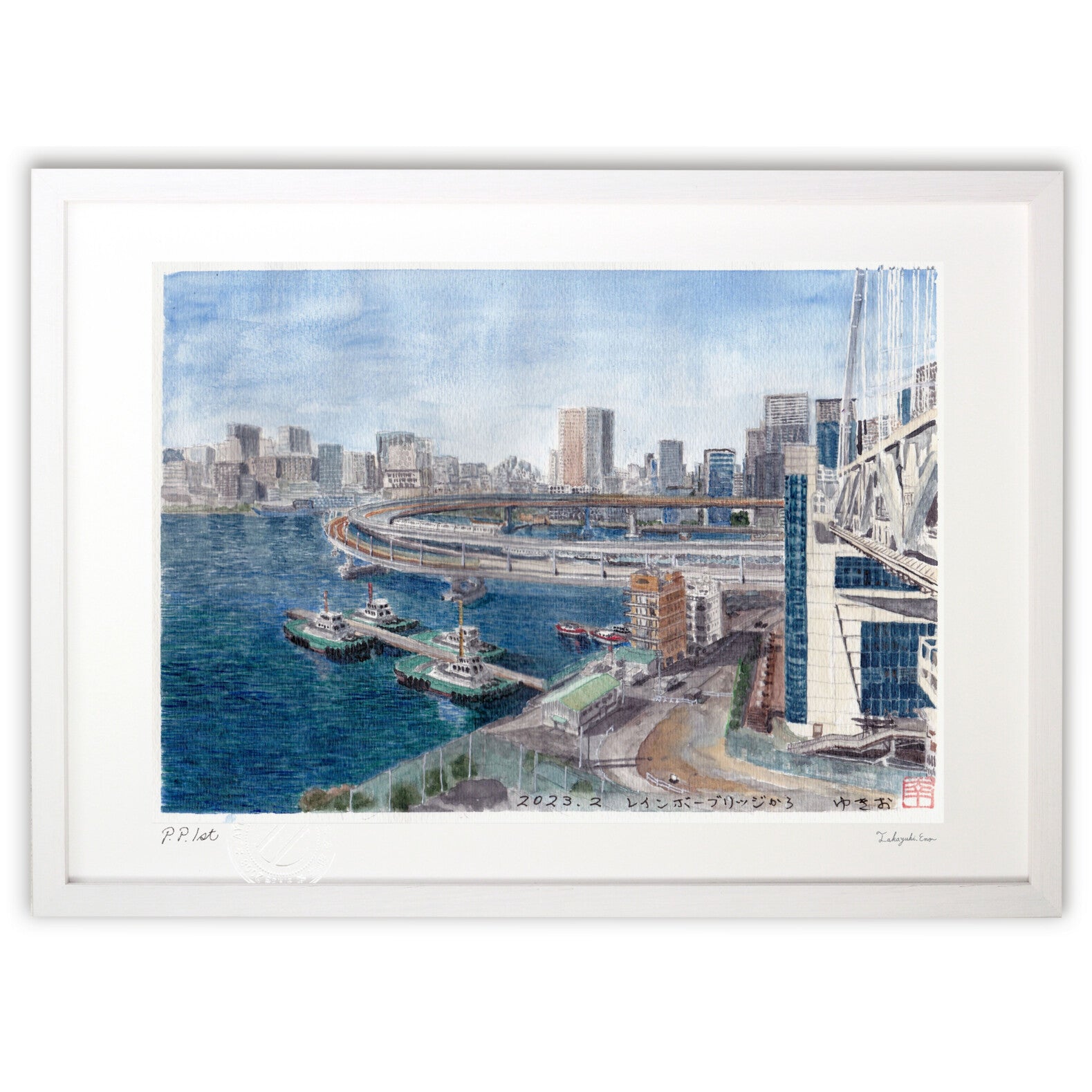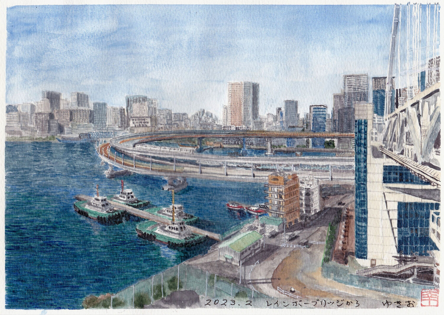水彩画 レインボーブリッジ上から芝浦ふ頭を見た景色です。