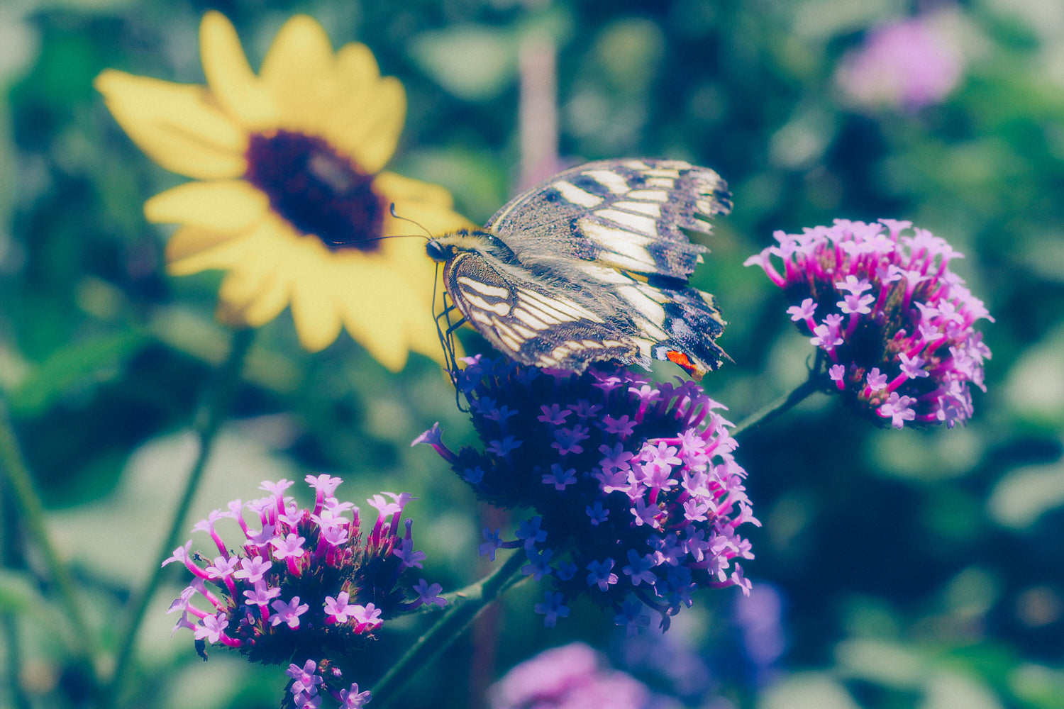 花畑にやってきたアゲハ蝶は、様々な花と戯れていました。