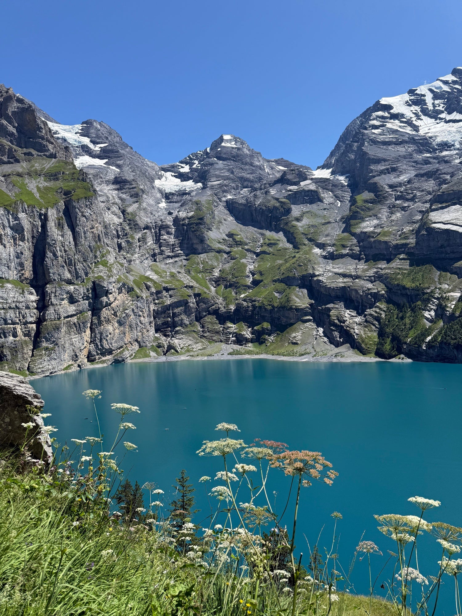手前に咲く高山植物の彩りが、澄んだエッシネン湖と雄大なアルプスの山々を引き立てます
