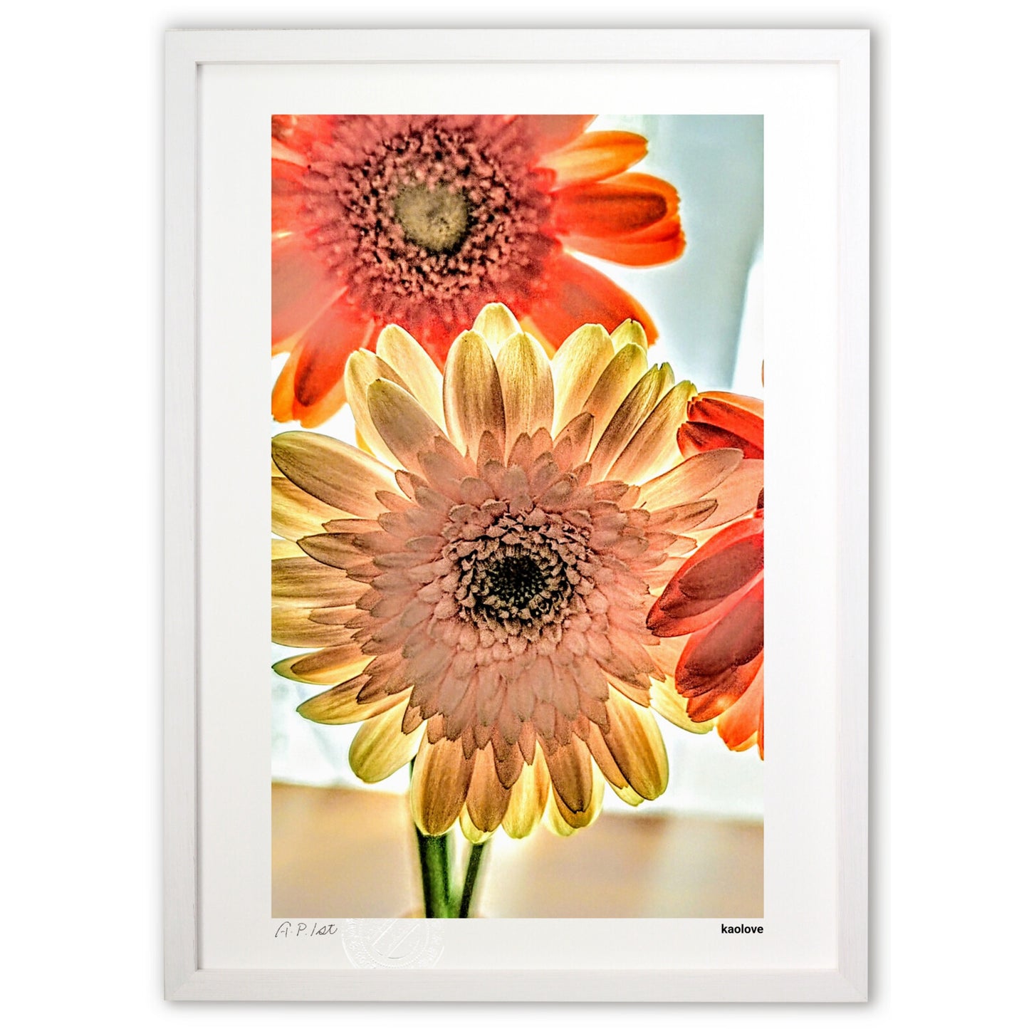 あゆわらの企画・制作・販売の作品。 画用紙のような質感の高級アート紙を採用。 発色が豊かなので繊細な色を忠実に再現。 印画紙ではないので、絵なのか写真なのか迷う不思議な印象です。 紙に光沢がなく、光を反射しないので、 蛍光灯の光で作品が見えづらくなることもありません。 色の再現性もこだわりました。 色調整は、最新技術で厳密に行うことが出来ます。正確に色を再現できるデジタル印刷で一枚一枚制作。 品質をチェックし、合格したものにあゆわらのエンボス印を入れて完成となります。