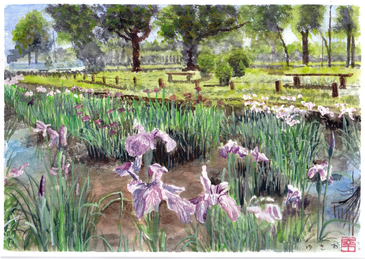 水彩画 ’葛飾菖蒲まつり’の時期の水元公園
