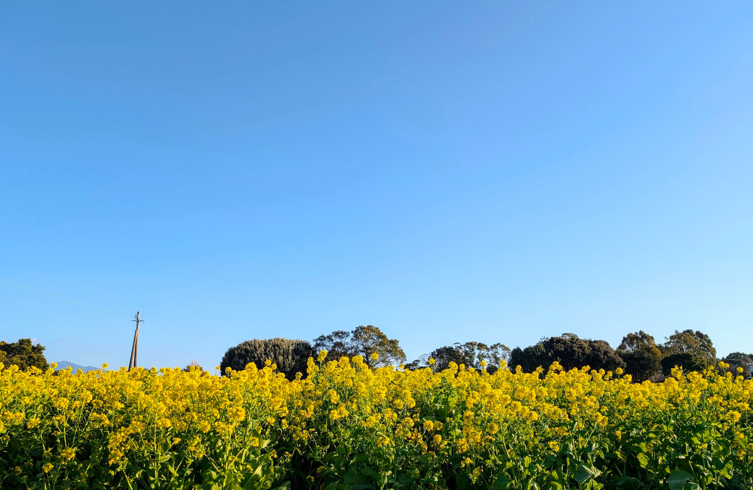 菜の花と青空をつなぐ、緑色の並ぶ丸い木。
