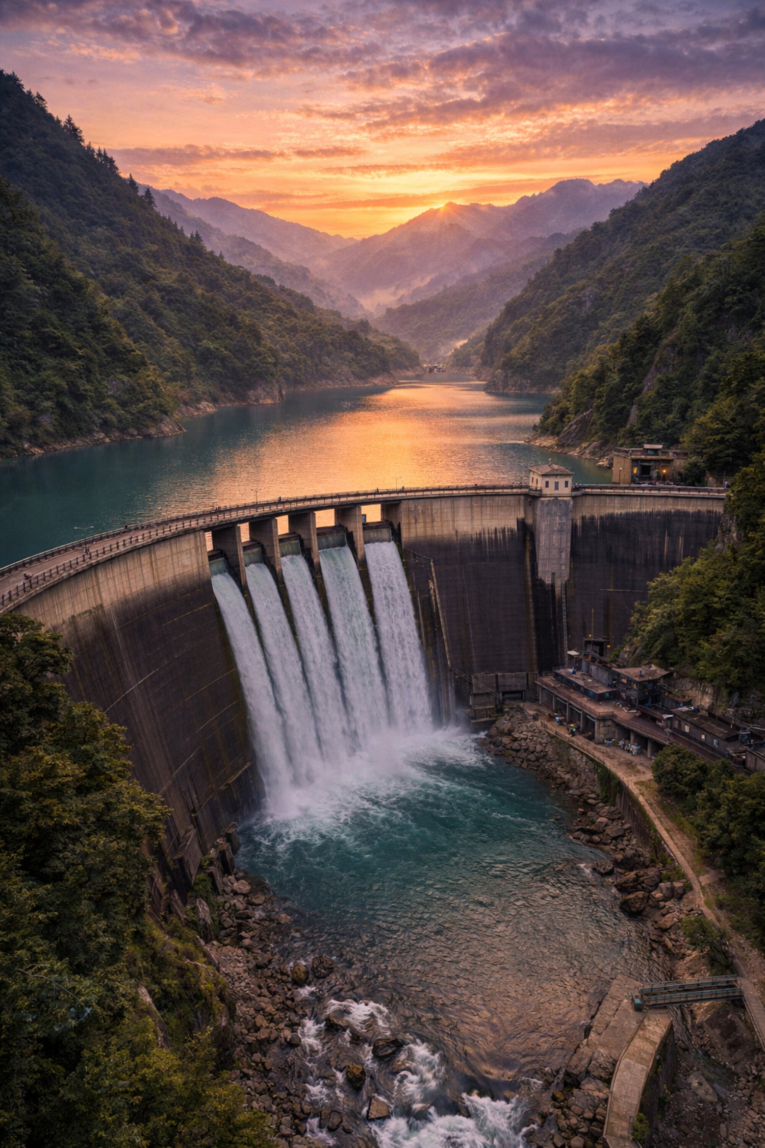 落日の水門 ― 渓谷に響く白い轟き