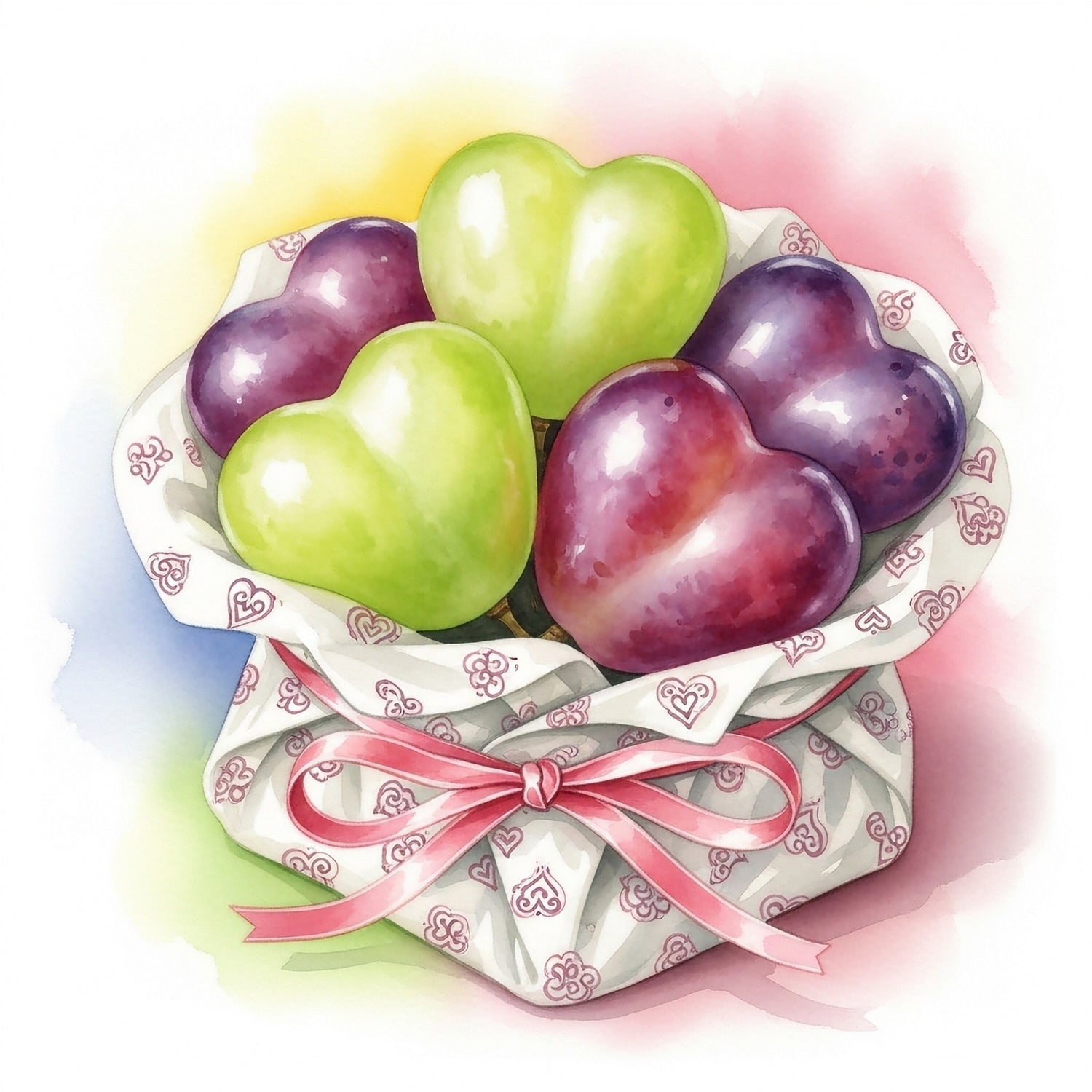 ころんとしたグリーンの果実の中心には、やわらかなピンクのハートがそっと寄り添い、甘くあたたかな想いを象徴しています。