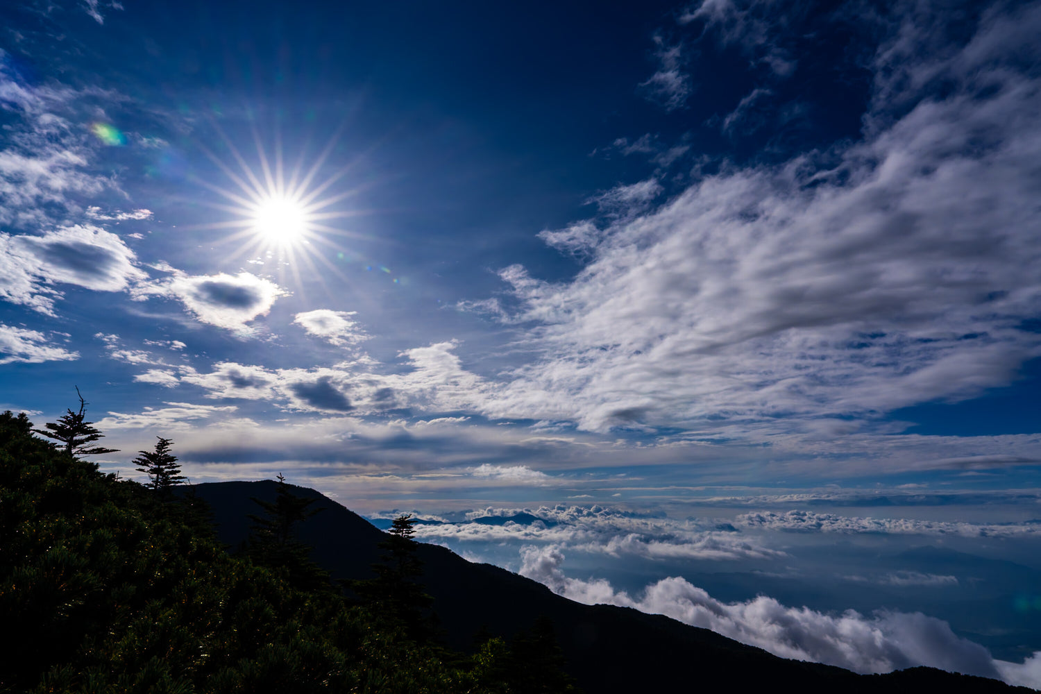 標高の高い山頂から見下ろす、雄大な雲海と輝く太陽の情景を捉えた一枚です。