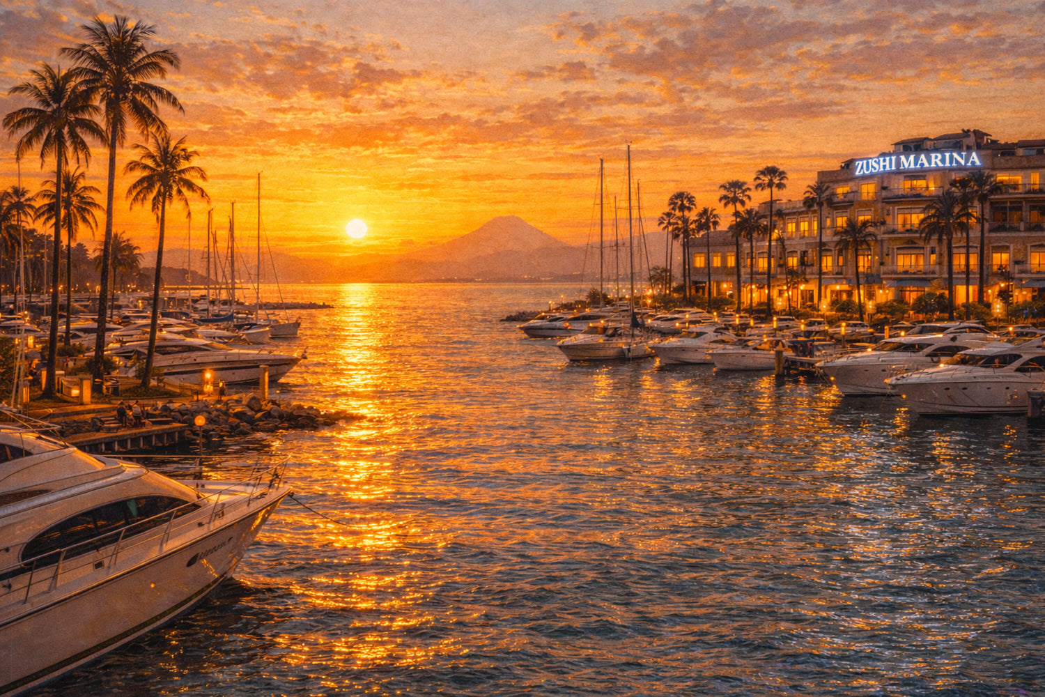 逗子マリーナの黄昏 ― 黄金の航跡と灯りの港