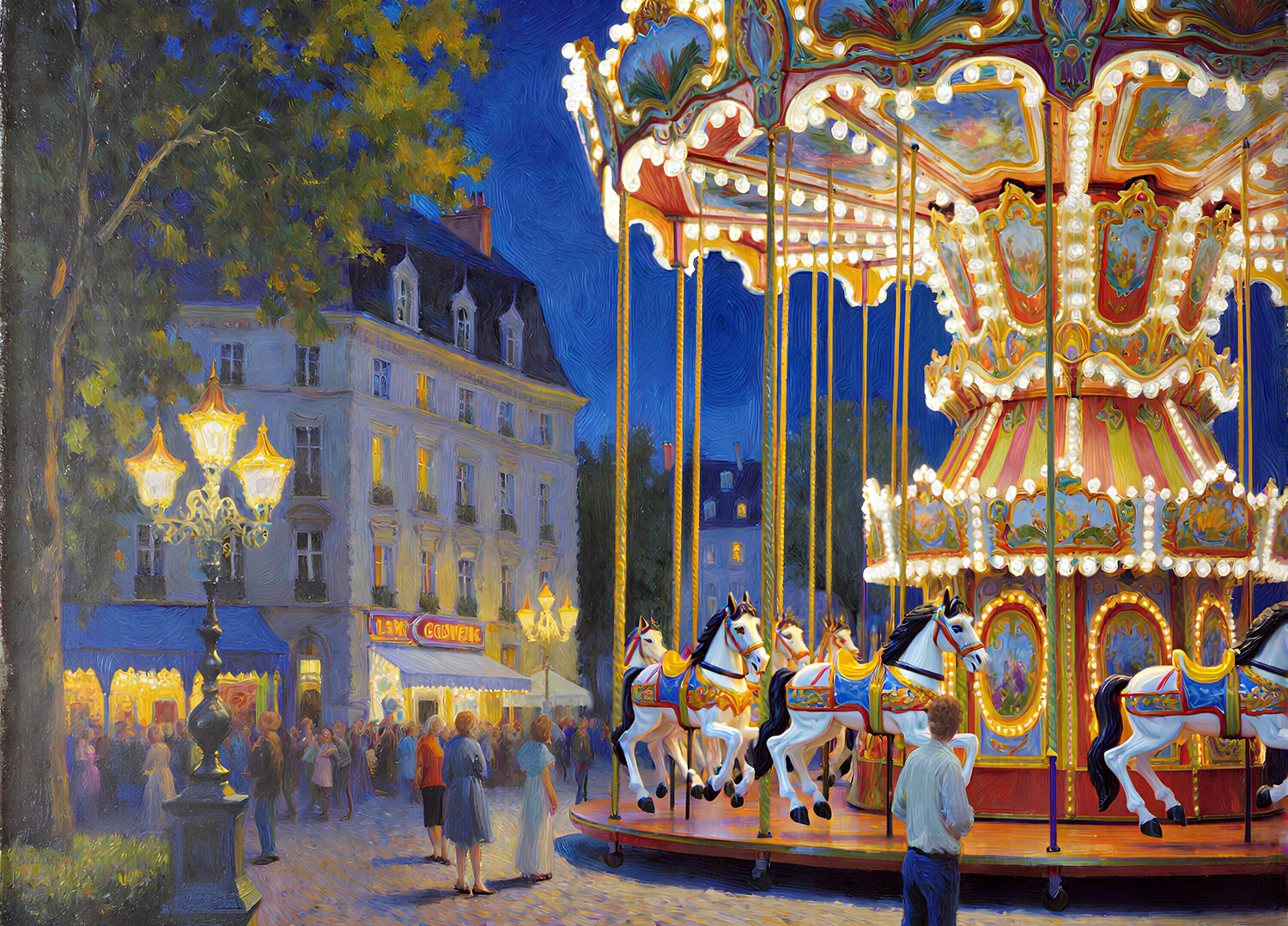 ヨーロッパの町中に設置された遊園地のメリーゴーランドの夜の風景。