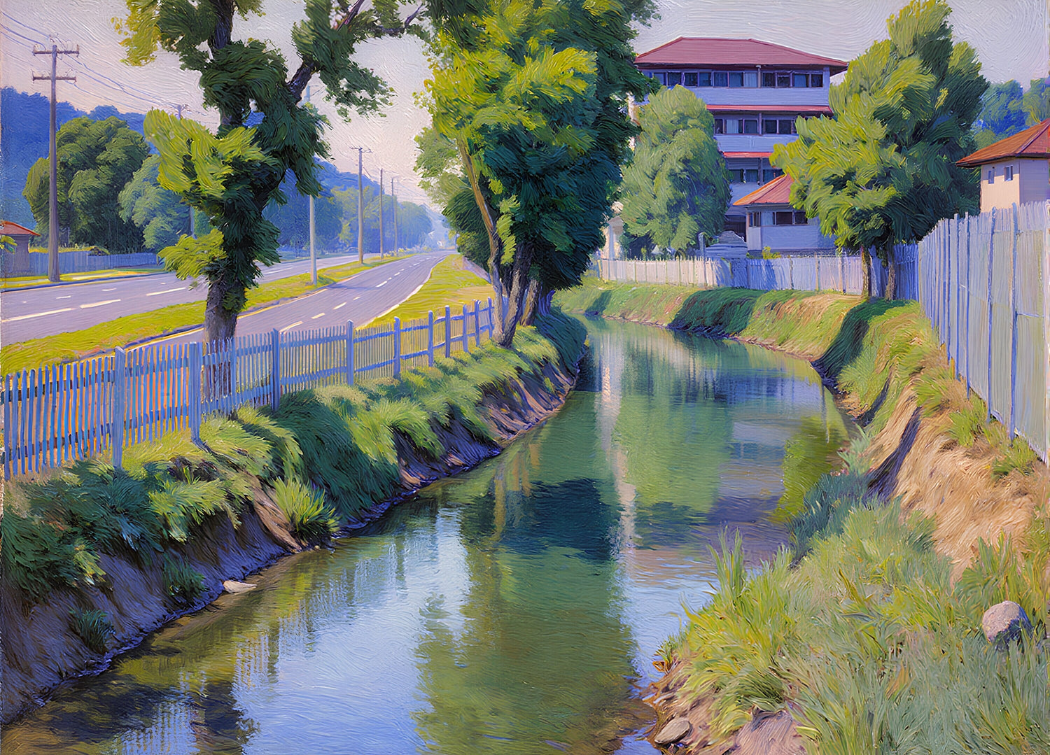 よく整備されて広くて真っ直ぐな川が郊外を流れている。