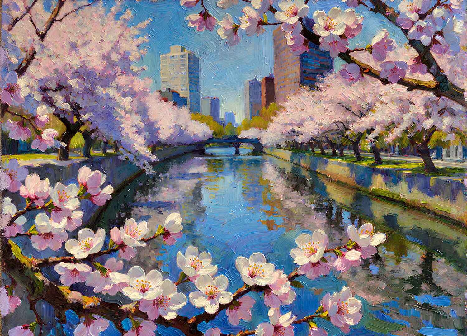 都市の大きな川の両側に街路樹の桜が咲いている。