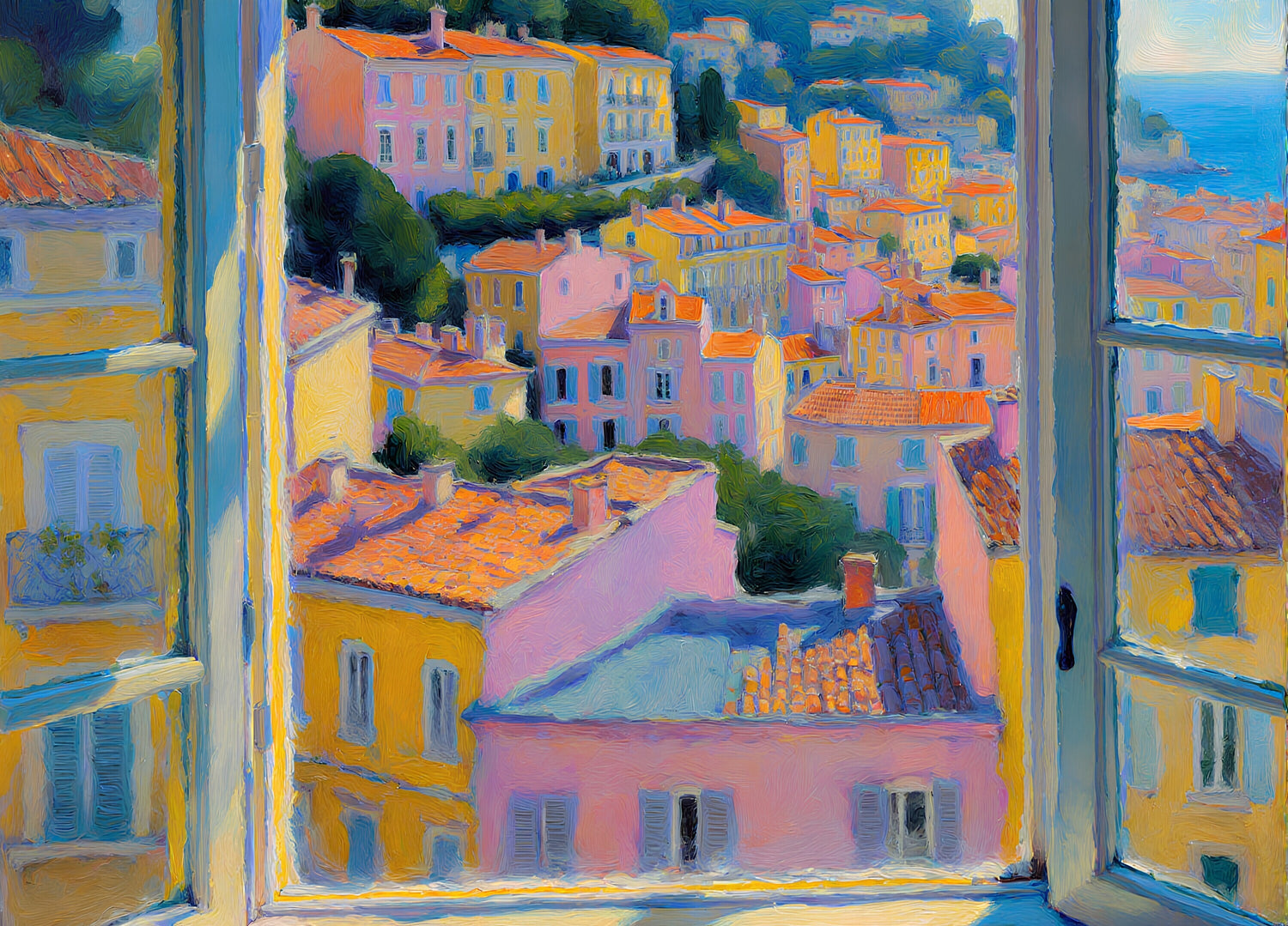 マントンの街を見渡す静かで日当たりの良い部屋からの長めです。柔らかな光が差し、夏のそよ風が吹いています。