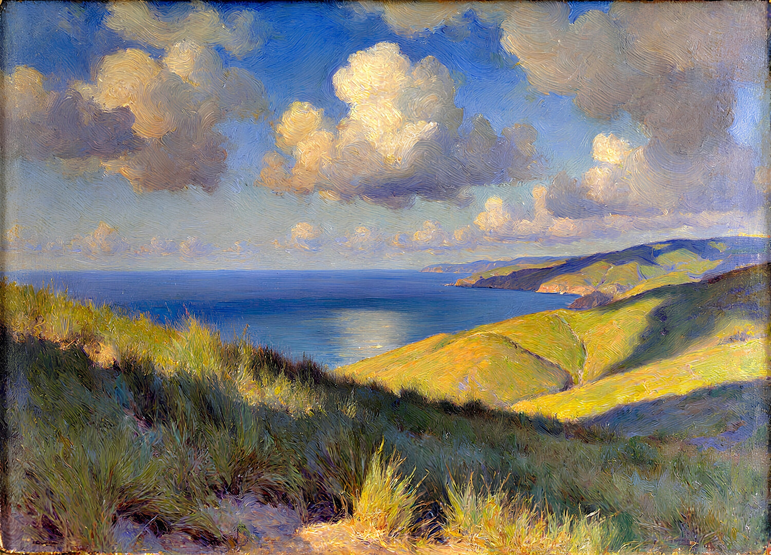遠く穏やかな海を見下ろす、陽光に照らされた丘