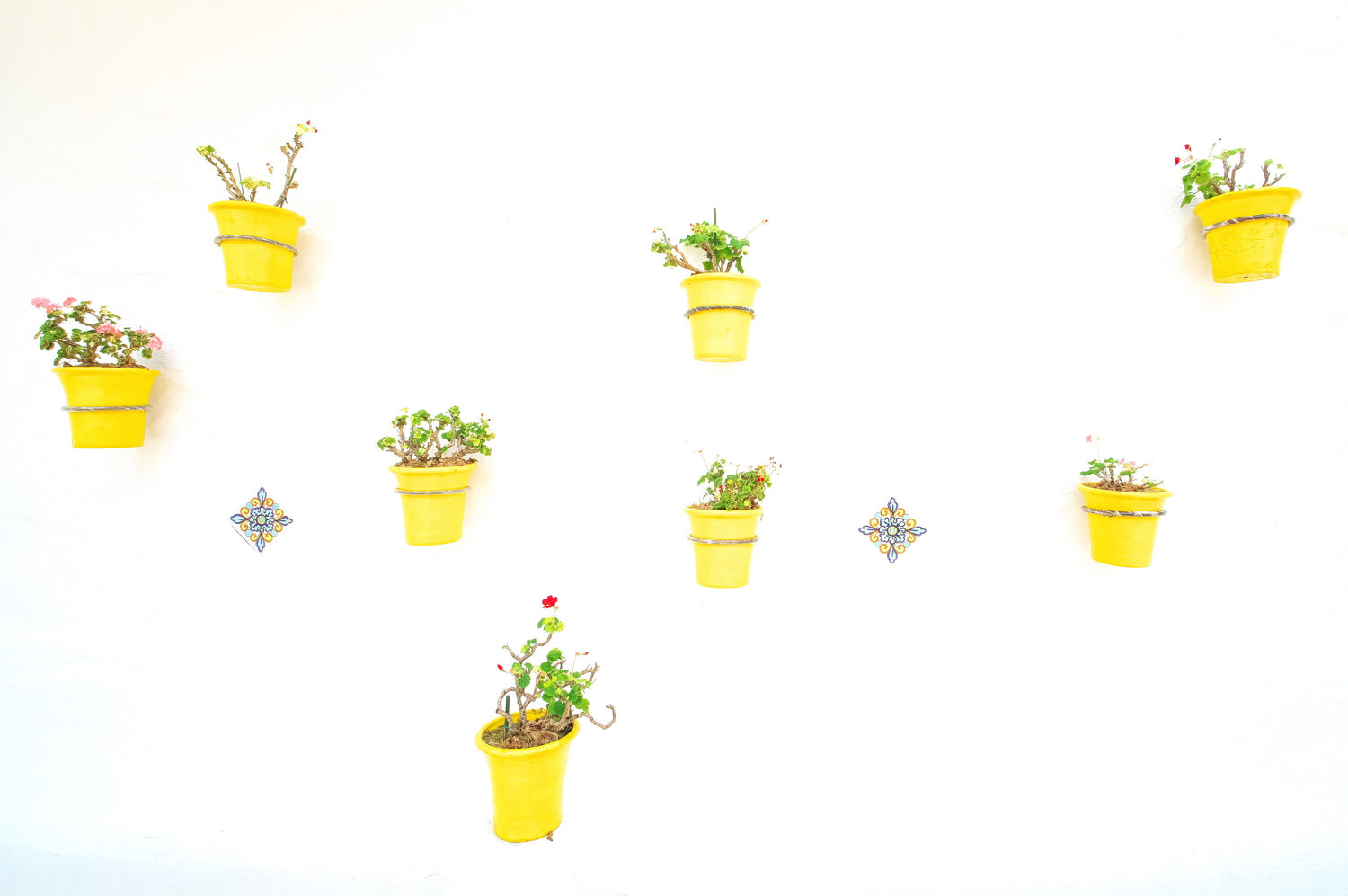 真っ白な壁に規則正しく並べられた黄色い鉢植えは、まるで壁をキャンバスに見立てたアート作品のよう。