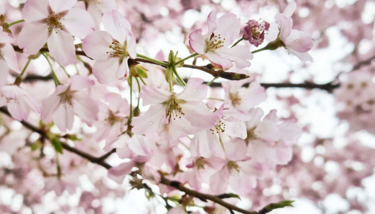 淡いピンクの花と透明な水滴が光を受けて輝き、静かで穏やかな春の時間を感じさせます。