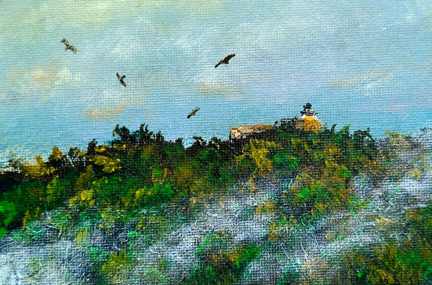 雨上がり、城跡のある山には霧があちこちから出て、小さい山が壮大に見えます。雨も上がりトンビも嬉しそうに飛んでいます。