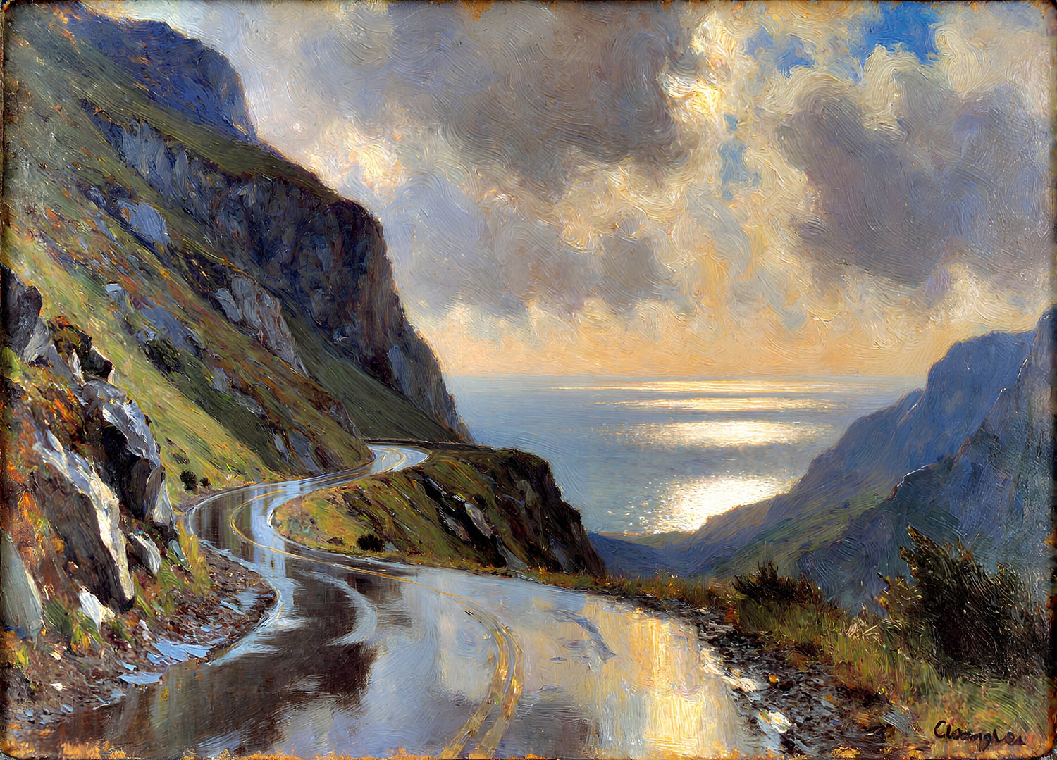 柔らかな日差しを反射する濡れた曲がりくねった道