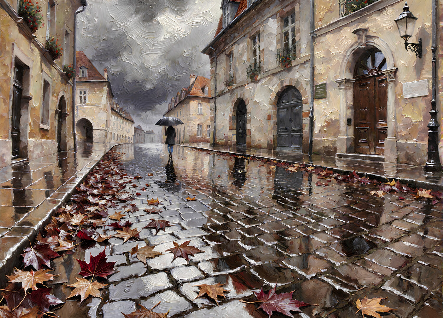 濡れた石畳の道は、茶色や深紅の落ち葉で覆われています。