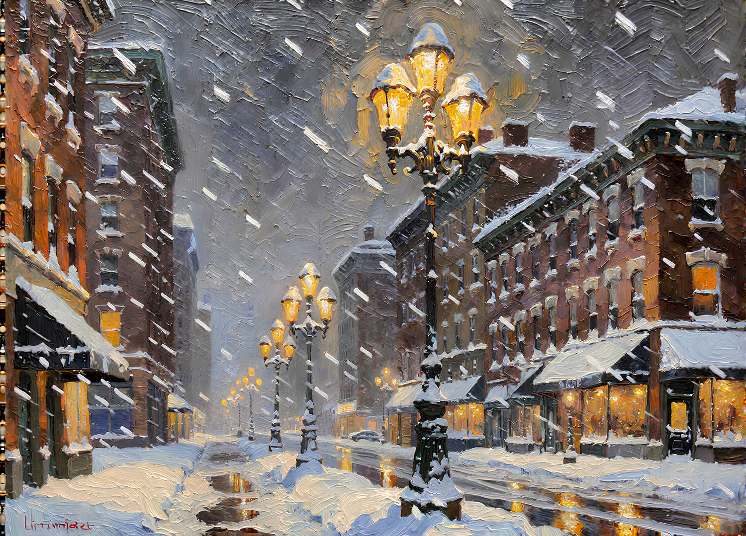街灯の温かみのある光が雪に覆われた通りを照らしている。