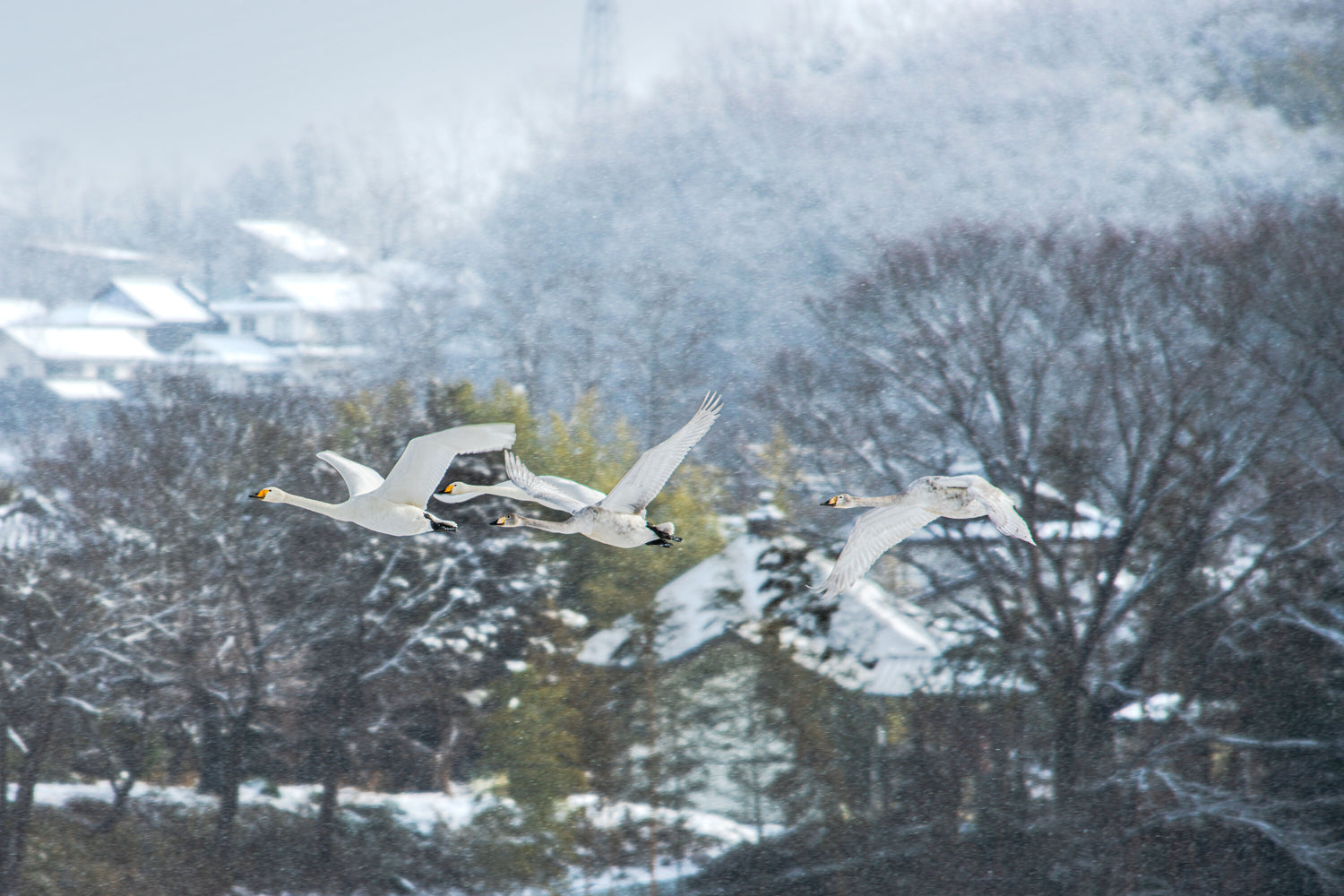 雪が舞う中を餌場に向かう白鳥たち