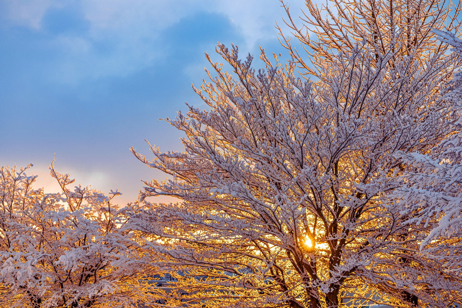 冬の朝、木の枝に積もった雪は白い葉が茂っているかのよう