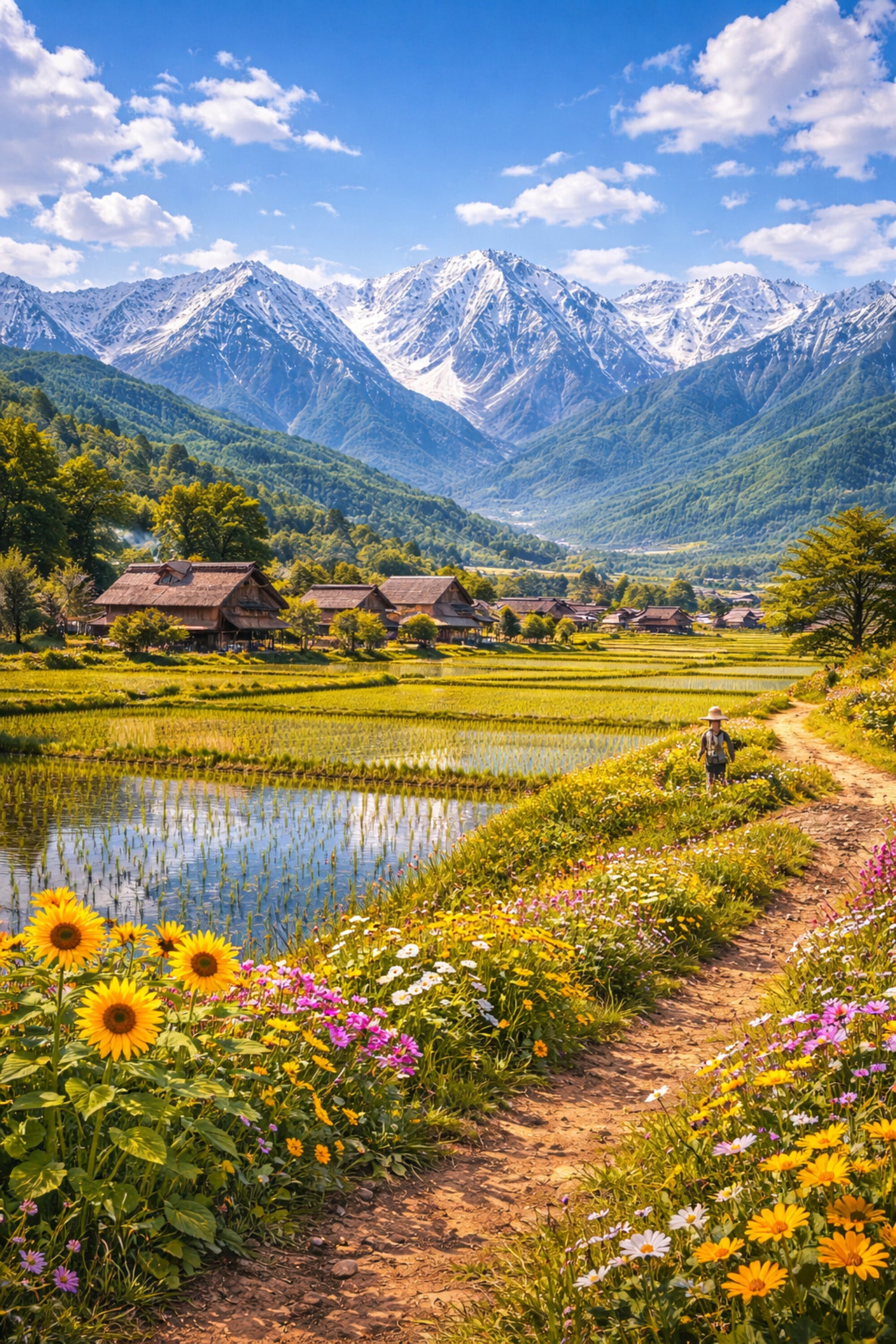 雪をいただく山々を背景に、田園と集落、花咲く里道が穏やかに広がる日本の原風景を描いた作品です。