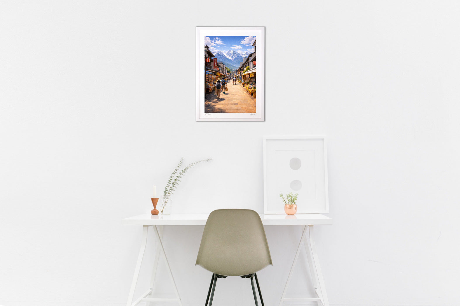 雪をいただく雄大な山々を背景に、観光客でにぎわう商店街の情景を描いた風景作品です。