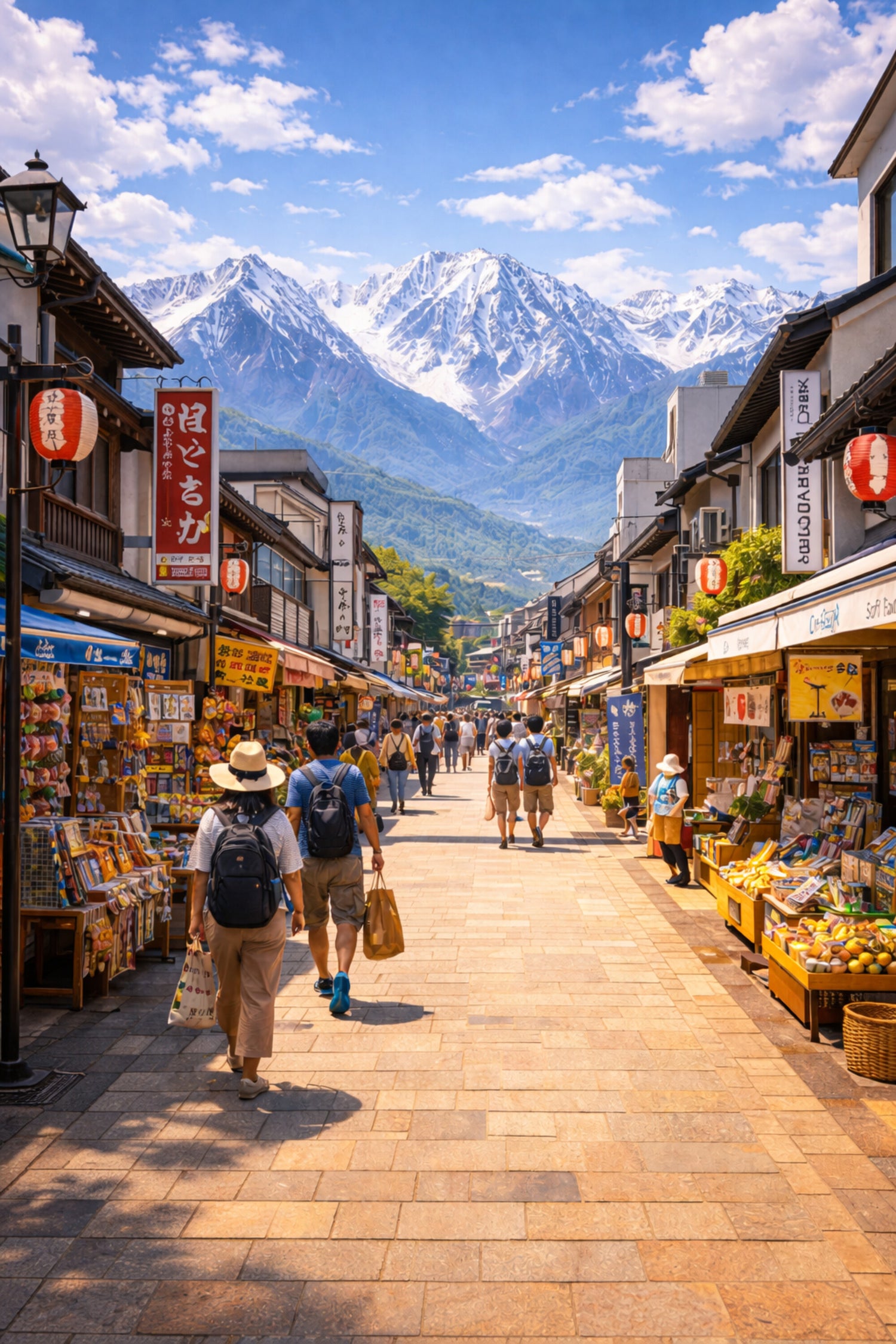 雪山を望む、にぎわう観光街の夏景色。
