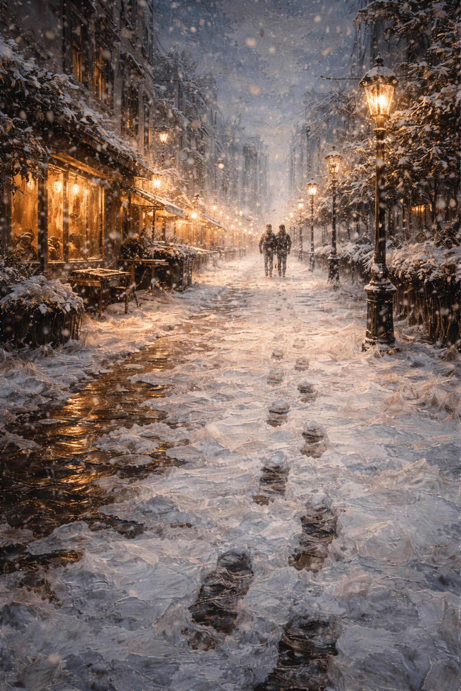 雪が静かに降り積もる夜の街を、寄り添いながら歩く二人の姿を描いた作品です。