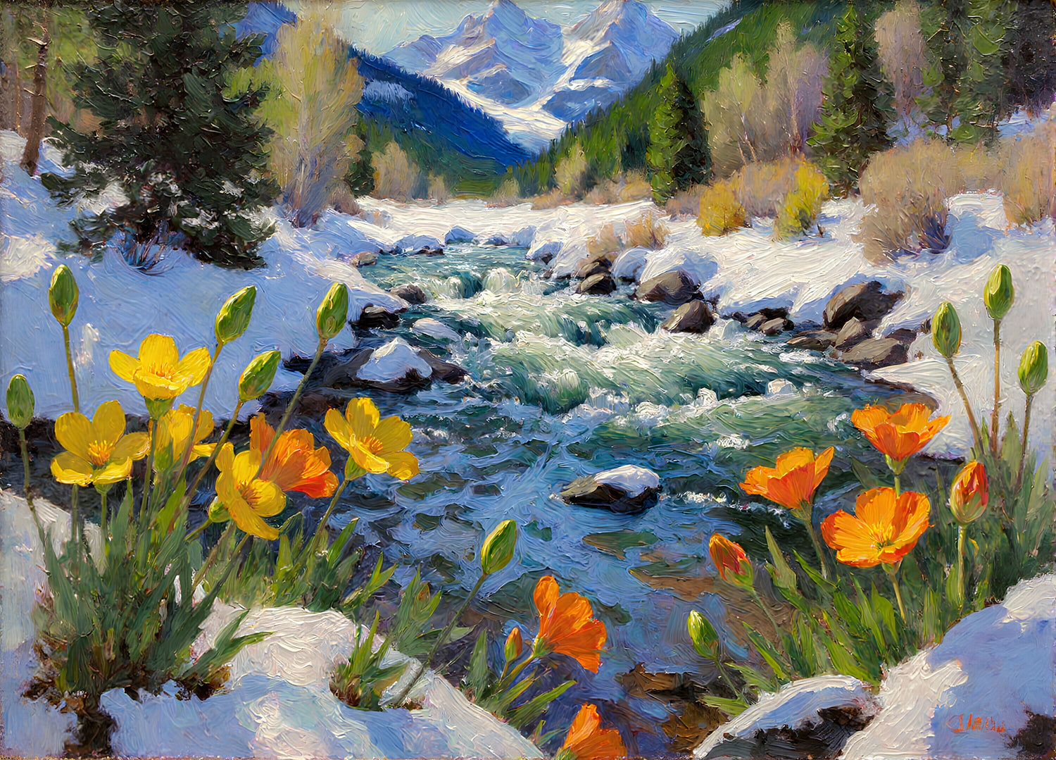 濃い緑や深い青の山々、明るい黄色とオレンジの花、鮮やかな緑の新芽が彩度の高い油彩の厚塗り風に描かれ、春の喜びをドラマチックに表現しています。