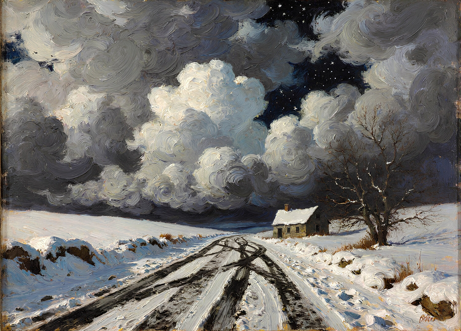 雪と雲の「白」の存在感は支配的で彫刻的であり、生々しく感情的な、厚く表情豊かな厚塗りの筆致で描かれている。