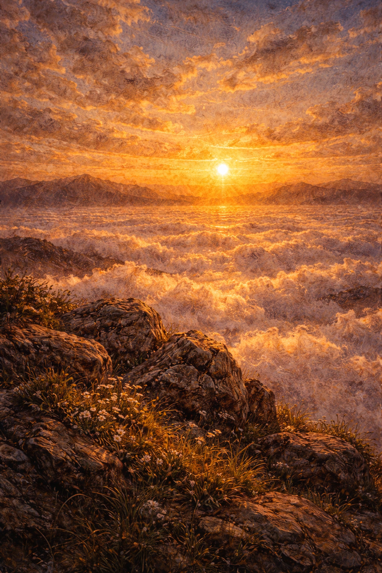 雲海の向こうに沈みゆく太陽が、世界を黄金色に染め上げる壮大な風景作品です。