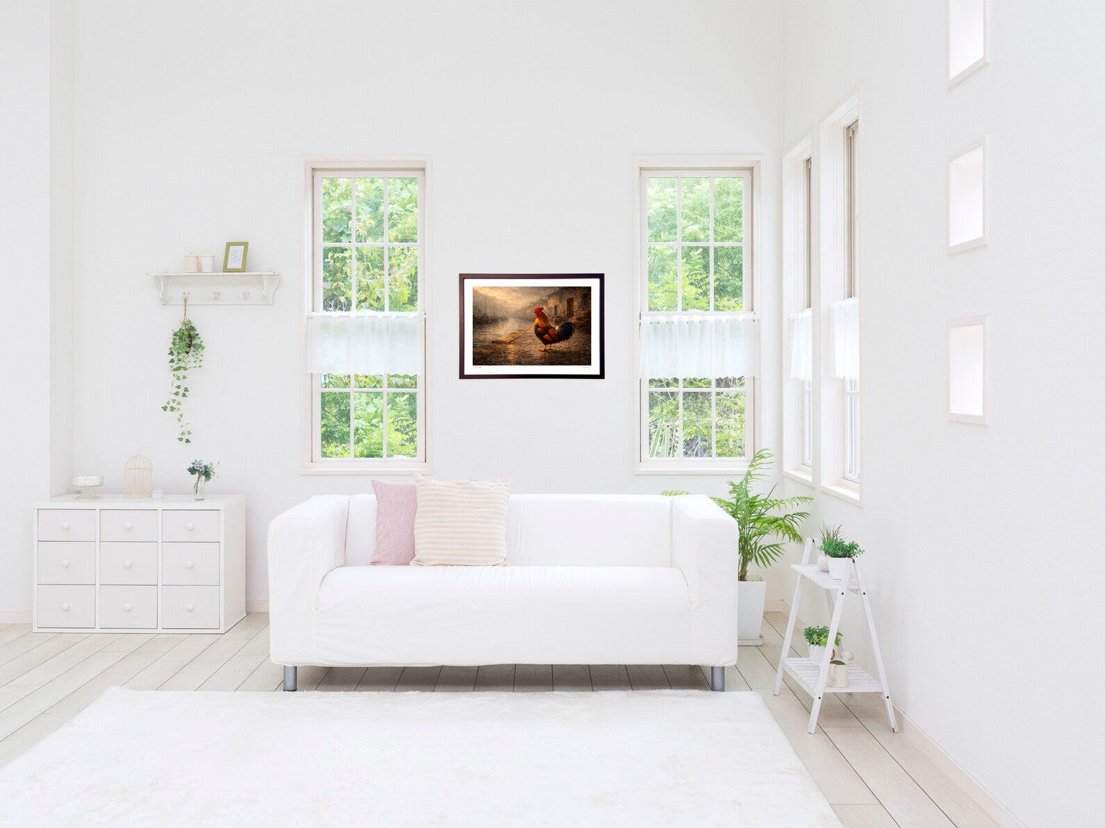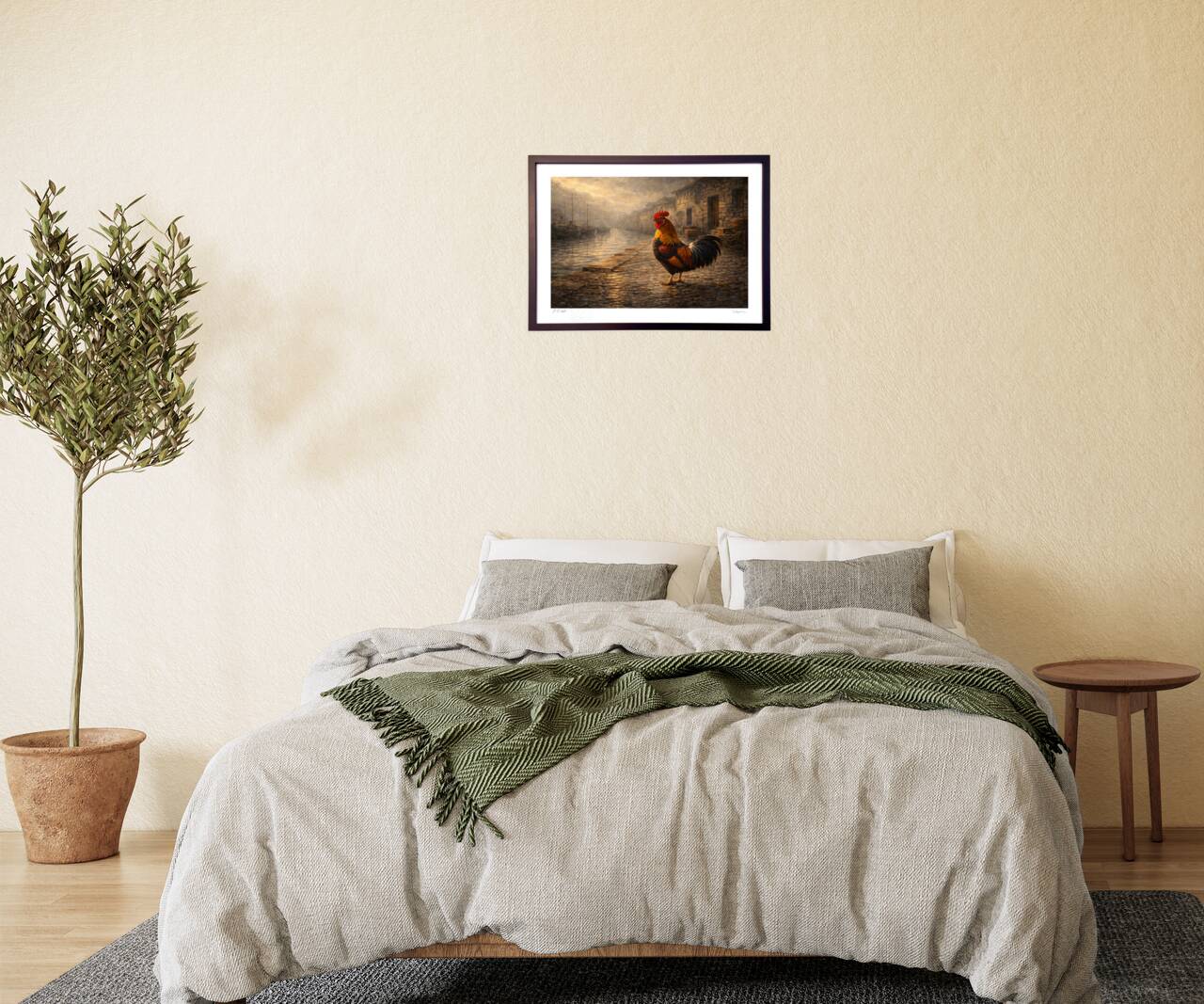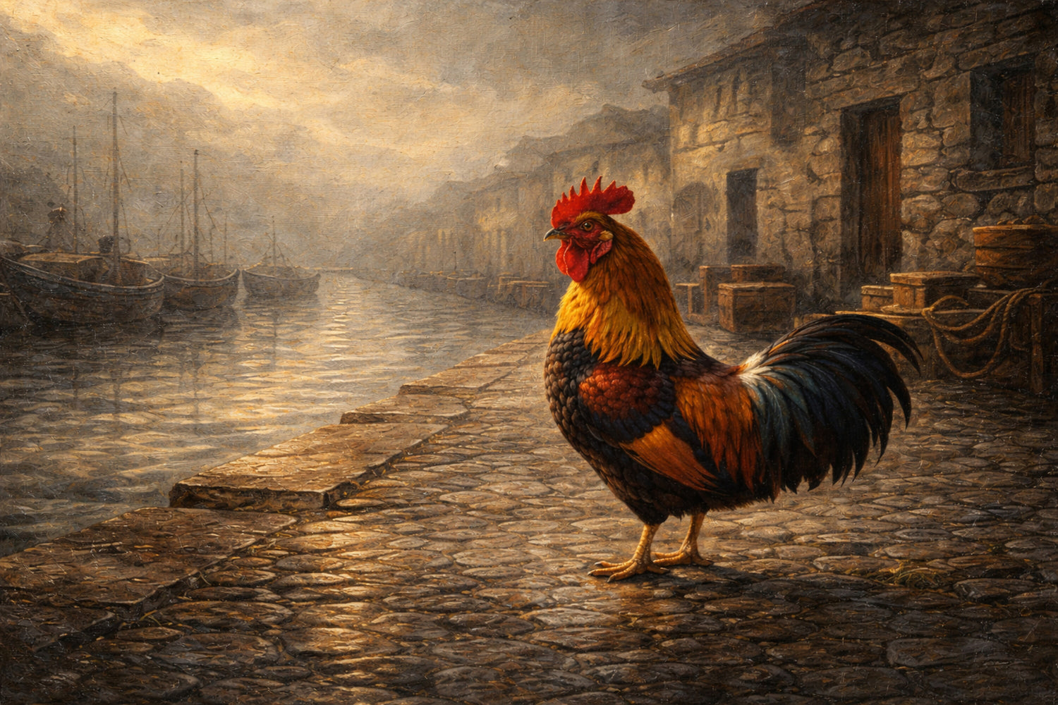 霧に包まれた港町の運河沿い。石畳はしっとりと濡れ、古い船影と石造りの建物が静かに並びます。その中心に、赤い冠の雄鶏が凛と立ち、旅の始まりを告げる前の“間”を守るように佇む——そんな情景を油彩風の質感で描きました。潮の匂い、湿った空気、遠くの気配が重なり、郷愁と静かな強さが胸に残る一枚。飾るほどに、心の中に小さな旅が生まれます。