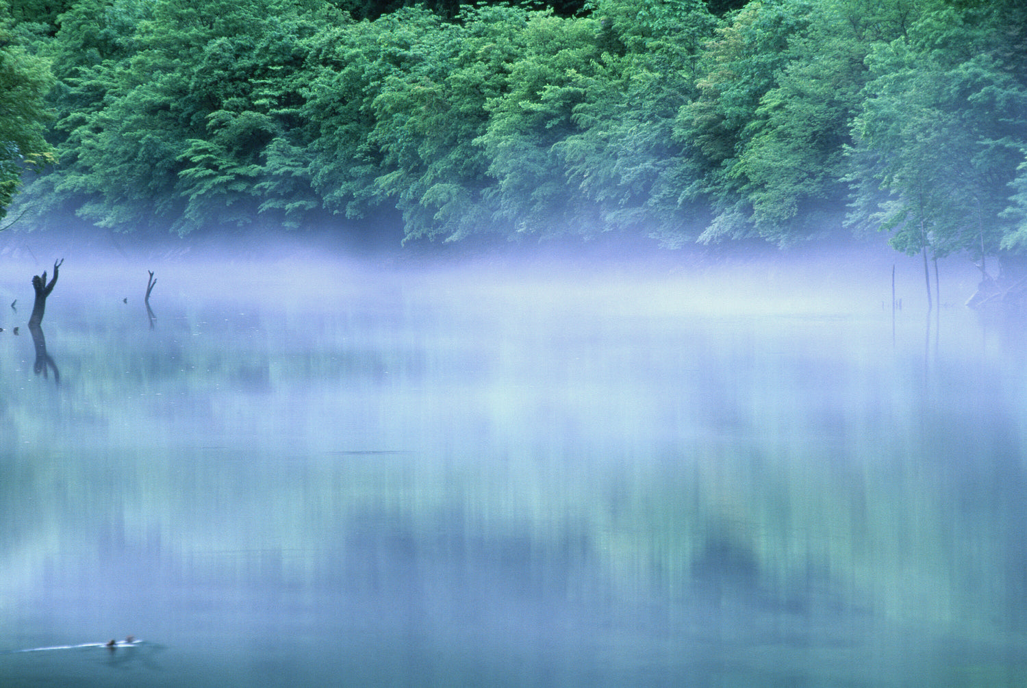 新緑目当てで立ち寄った湖に偶然霧が立ちこめてきたので、水鳥や朽木をアクセントにして撮影。
