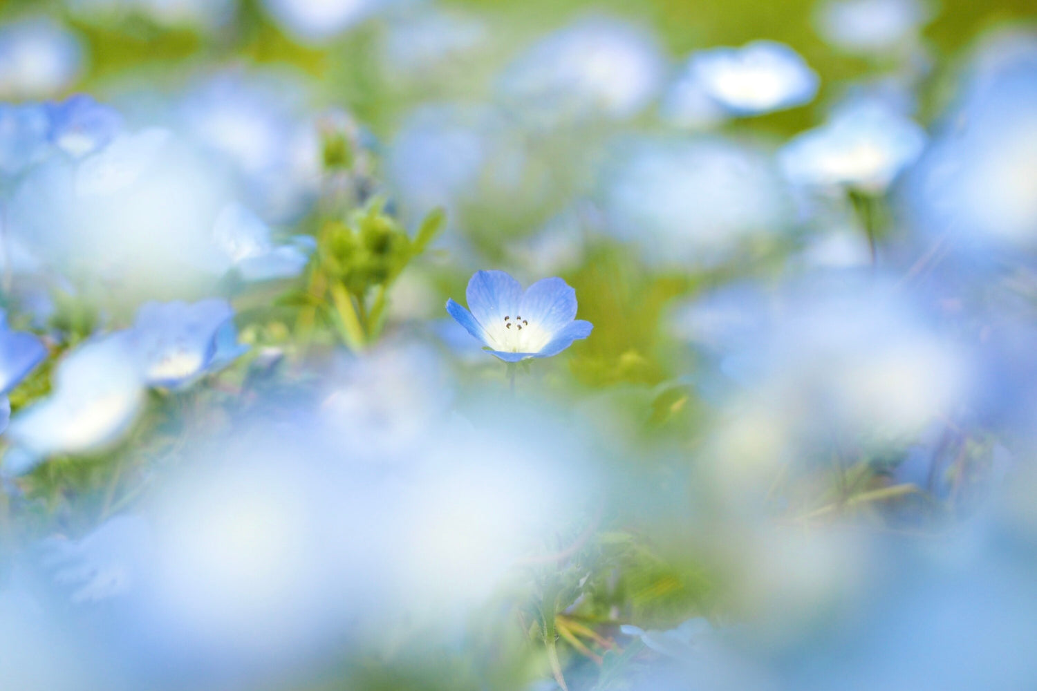 淡くぼやけた青い世界の真ん中で咲く、一輪のネモフィラが印象的でした。