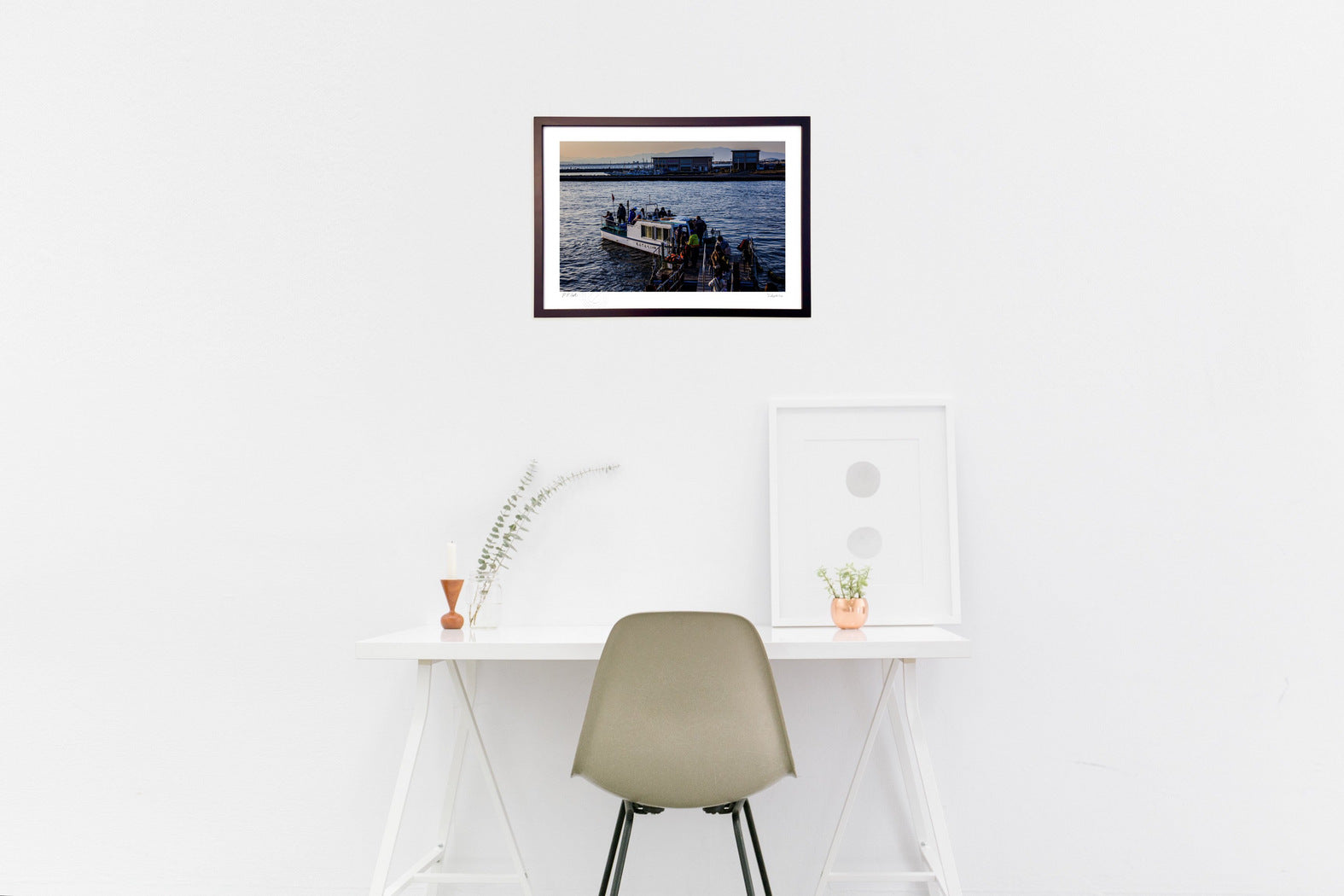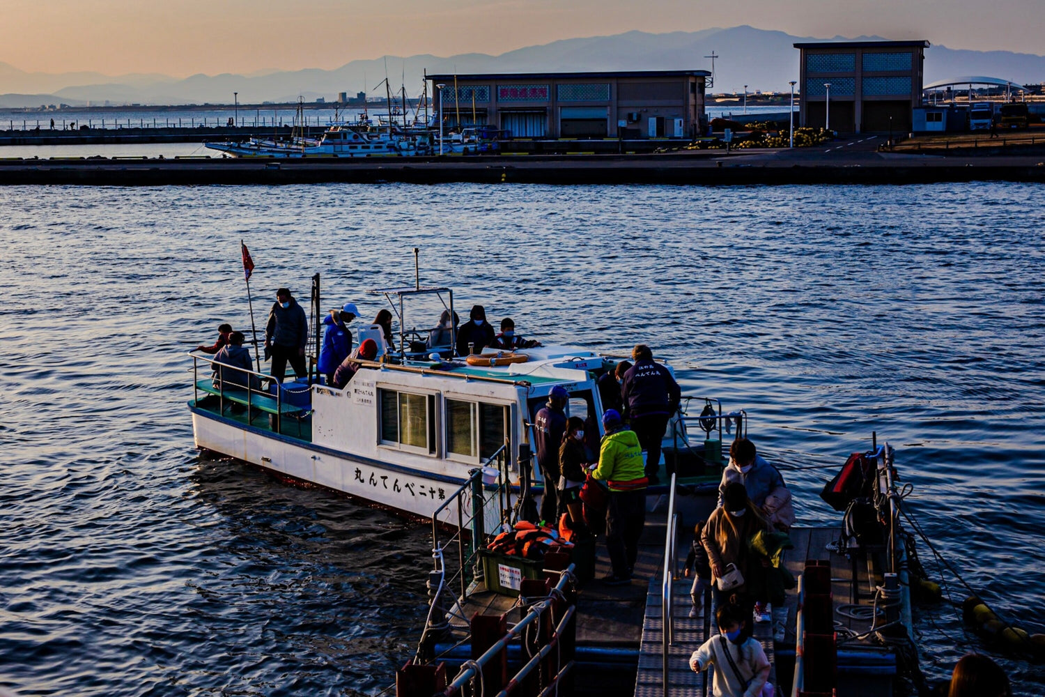澄み渡る青い海、穏やかな波音、そして船着場に降り立つ人々。旅の終わりと新たな始まりが交差する、特別な瞬間を切り取った一枚です。海の輝きと人々のシルエットが織りなす風景は、どこかノスタルジックでありながら、未来への希望を感じさせます。