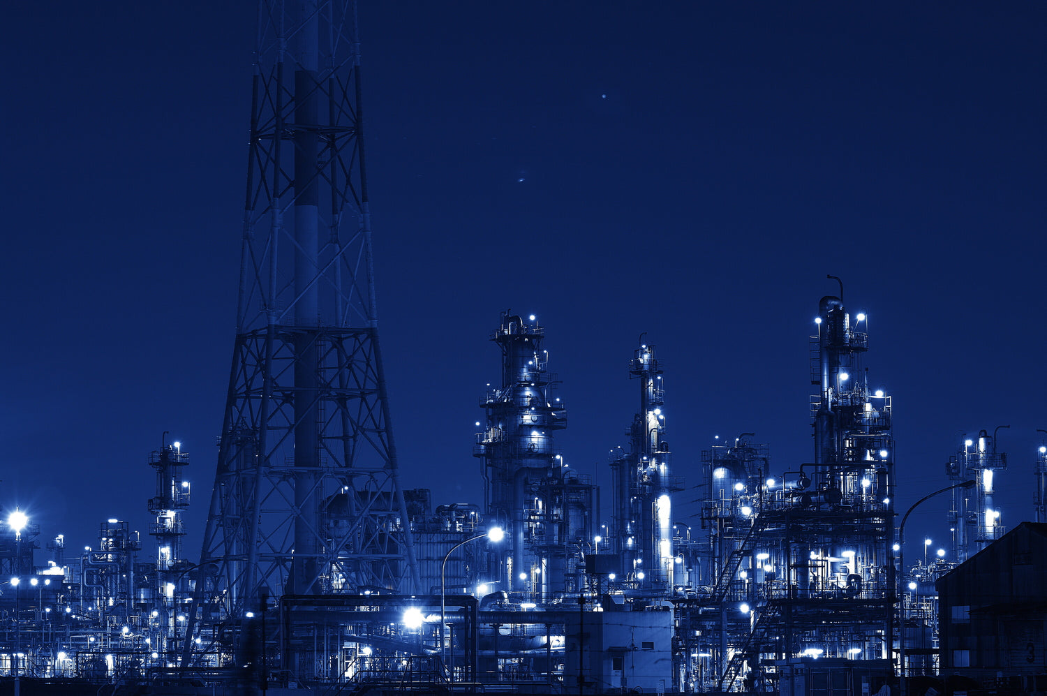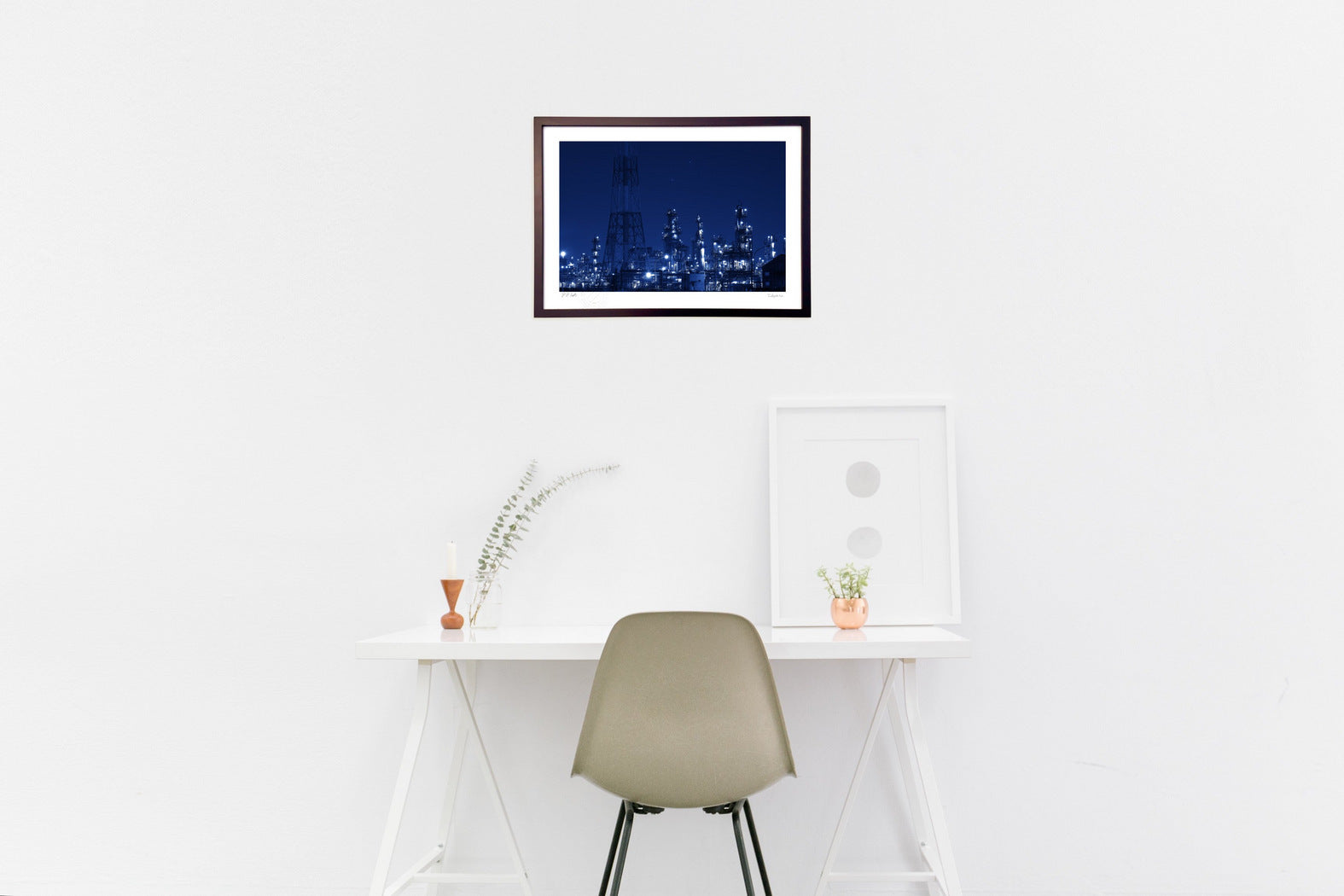この工場夜景は、都市のエネルギーを象徴するかのように、闇の中に浮かび上がる構造物と光のコントラストが際立っています。人工美の極致ともいえる景色が、見る者に深い余韻を残します。