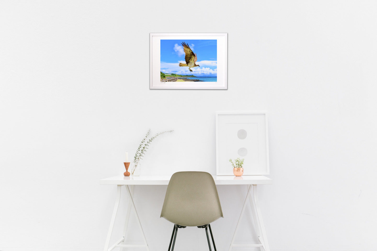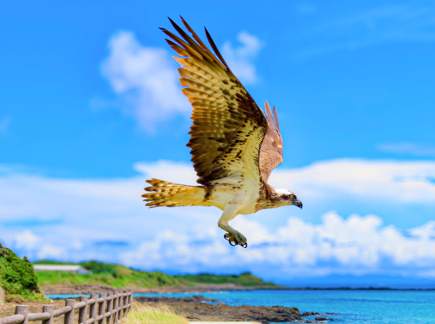 大きな翼を広げて飛ぶミサゴの姿。青空と海の広がりの中に、力強さと自由を感じました。