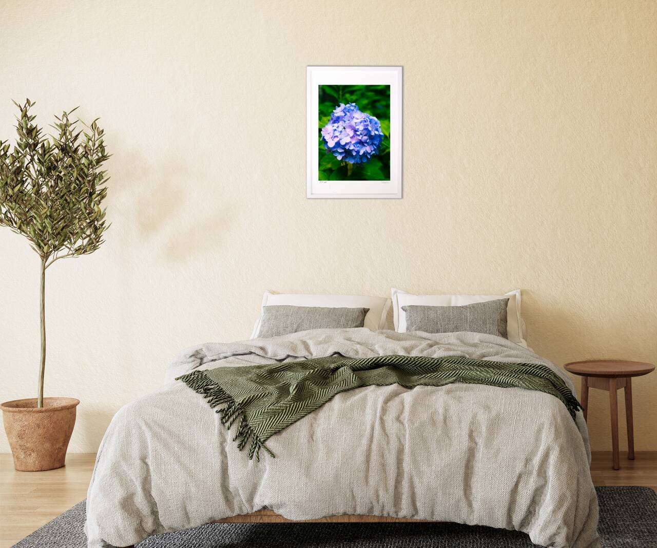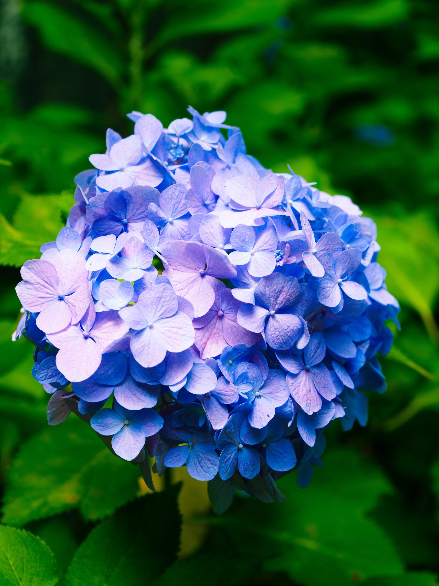 花の房は淡い紫から濃い青へと移ろうグラデーションが美しく、梅雨の季節特有のしっとりとした空気感を感じさせます。花びら一枚一枚の質感が丁寧に写され、柔らかな光を受けて輝いています。背景の緑が深く落ち着いたトーンで描かれているため、紫陽花の瑞々しい青紫がより一層引き立っています。