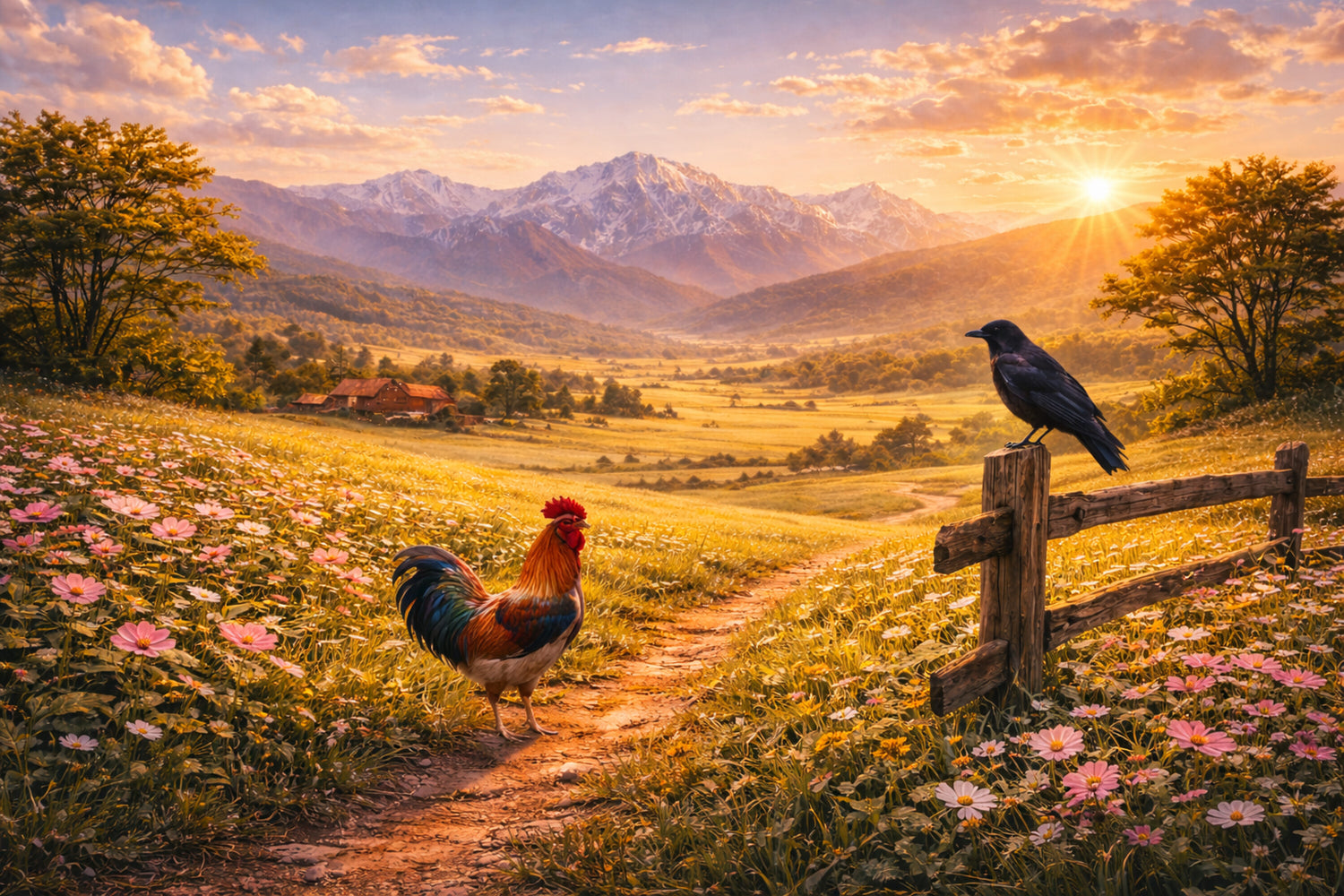 花咲く高原の小径で、雄鶏と一羽の鳥が静かに向き合う風景。