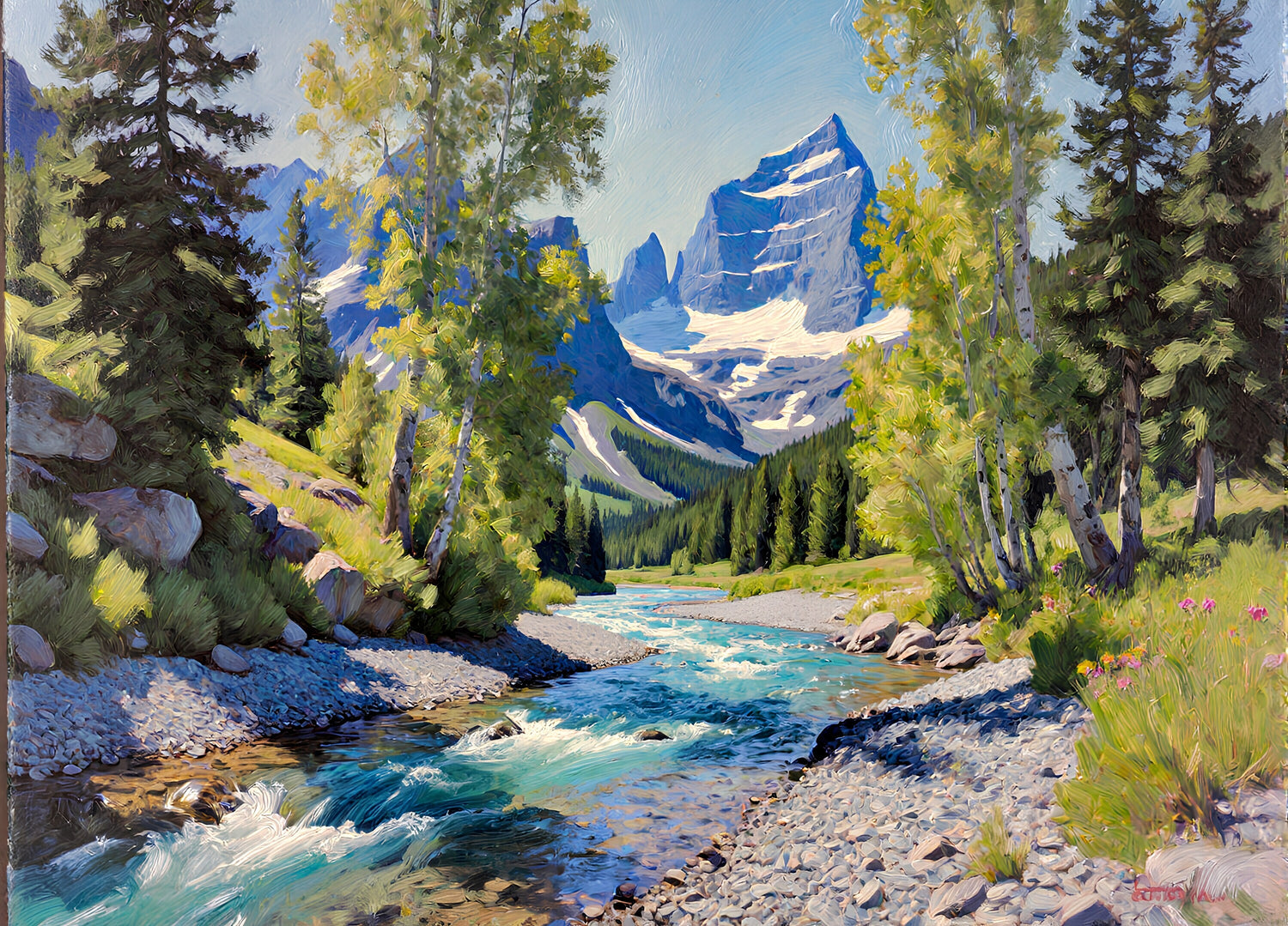 川の両側は砂利になっていて、その周りは鮮やかで濃い緑の木々が茂っている。