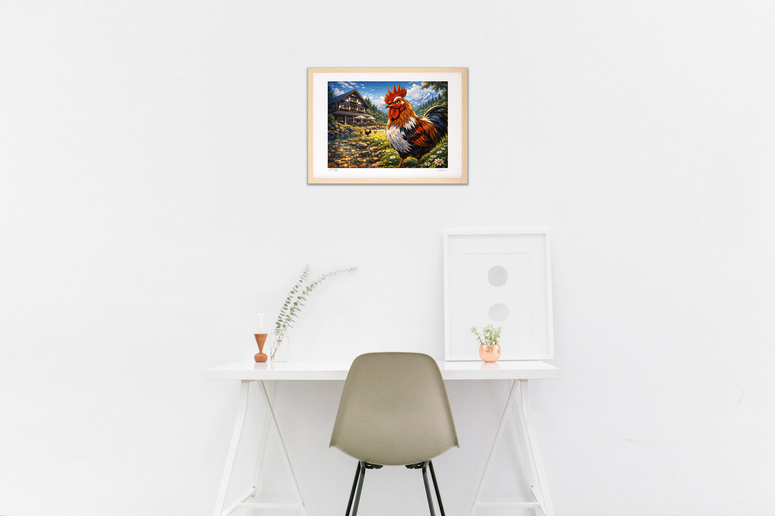 きらめく小川と高原のロッジ、誇り高き雄鶏が迎える休日。