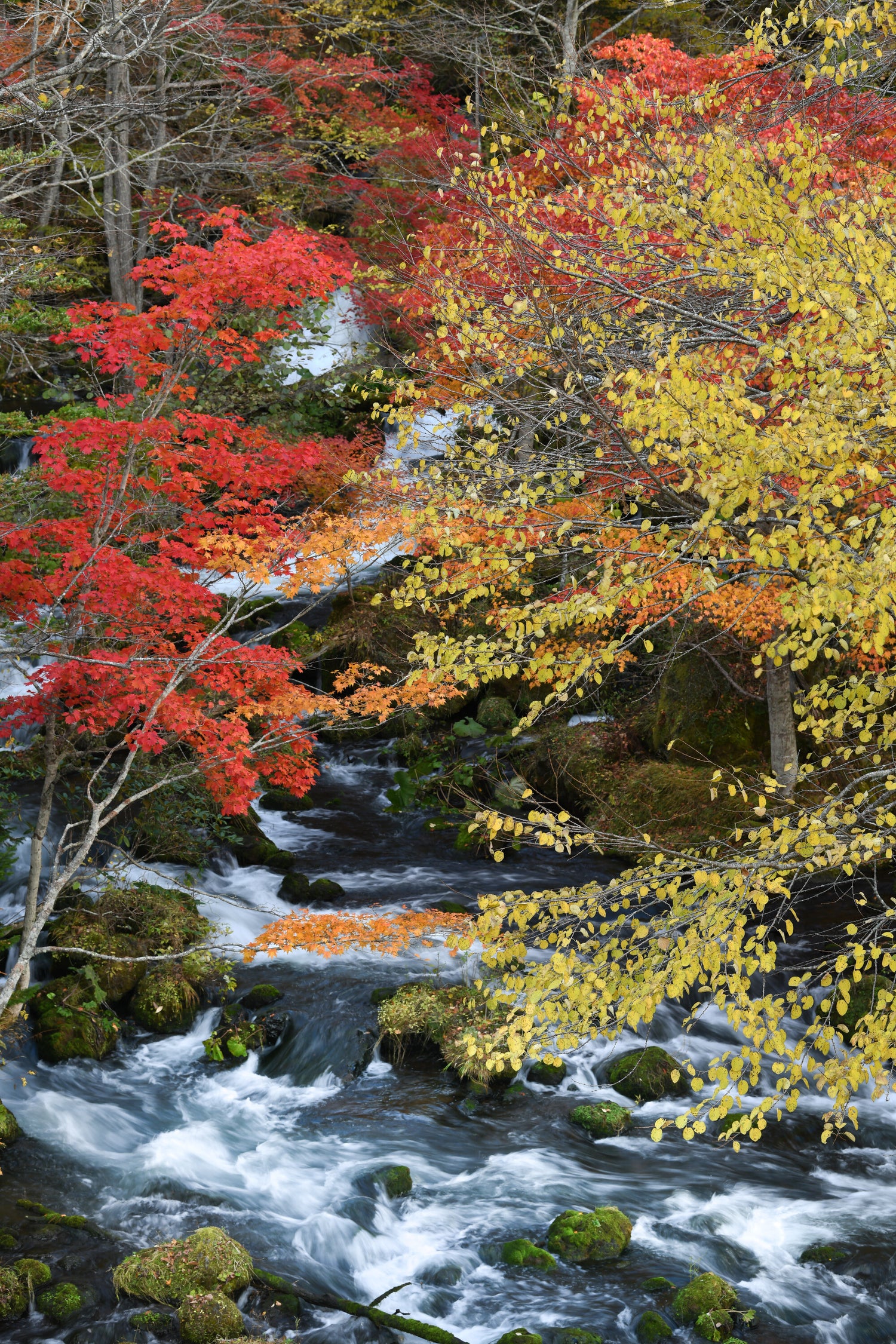 山から流れる清流と赤黄色の紅葉が美しいスポットです。