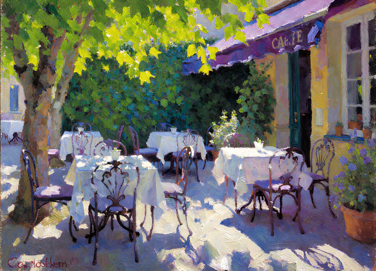ネオングリーンの葉の間から差し込む木漏れ日が、白いテーブルクロスと錬鉄製の椅子に、明るい白と淡い黄色の光の斑点が踊るようなモザイク模様を作り出している。