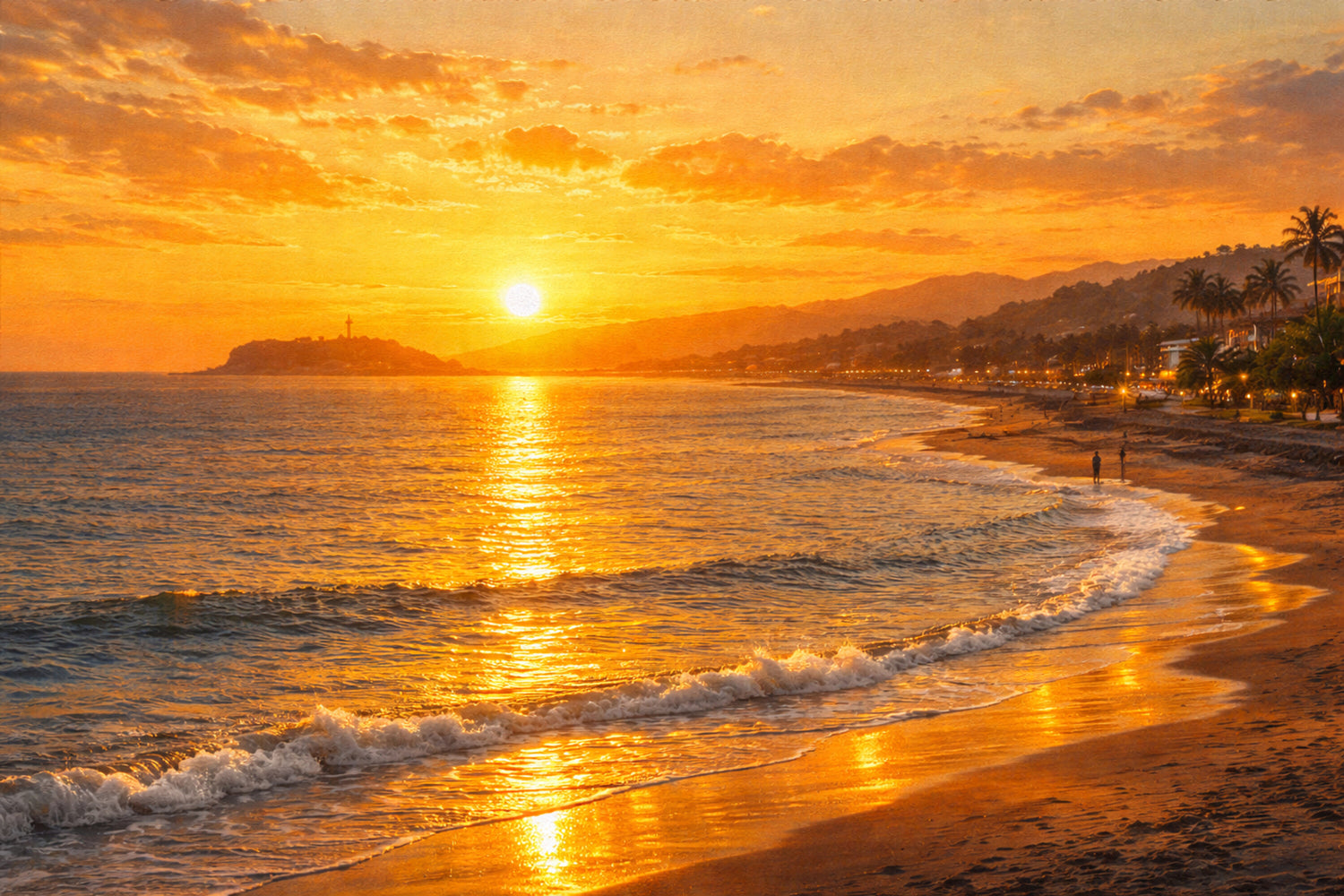 浜辺に残るのは、夕陽が描く黄金の反射と、静かに寄せる波のリズムだけ。人影を抑えたことで、光の道と海の呼吸がより鮮明になり、黄昏の時間そのものが画面に広がります。