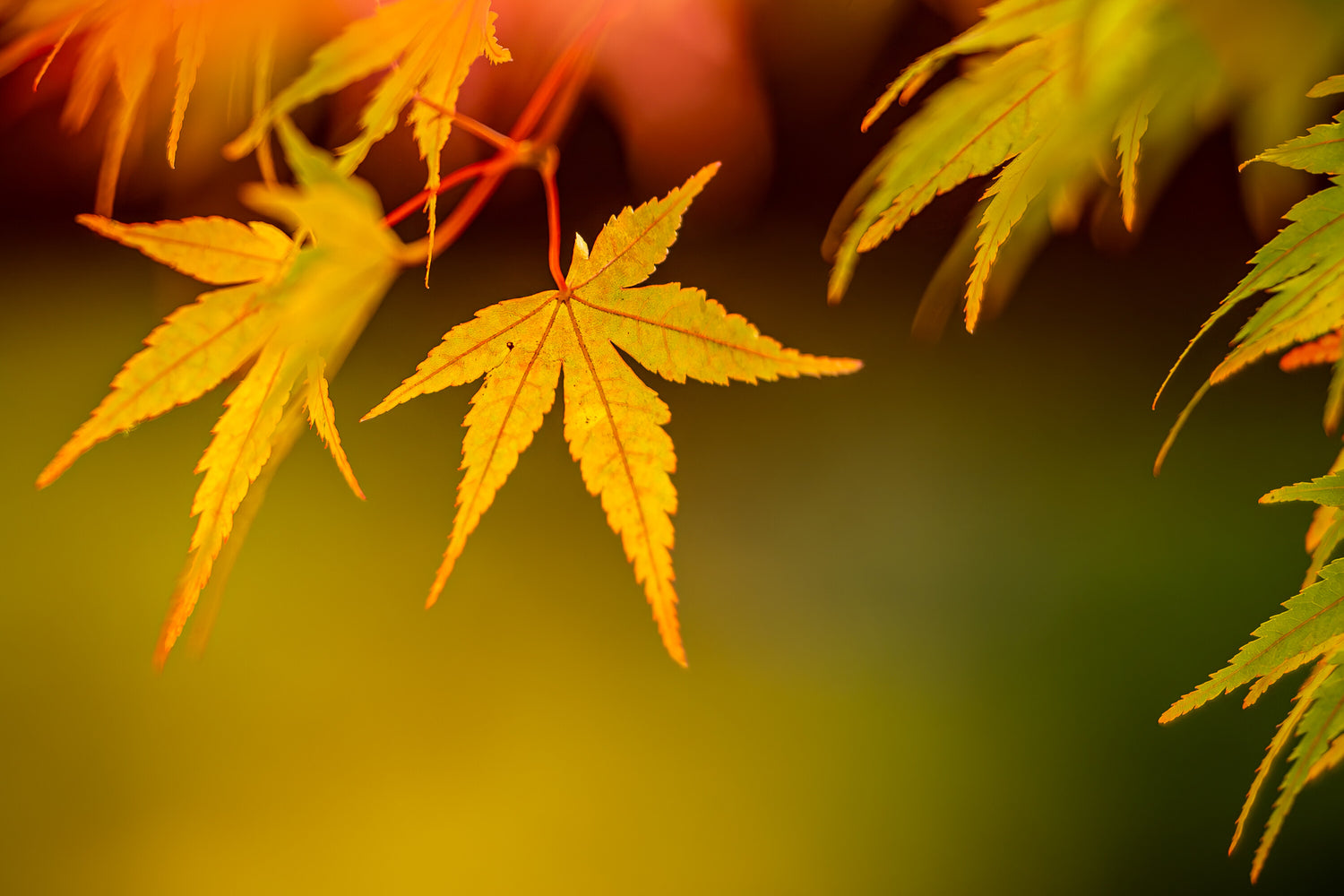 葉の繊細な形状と鮮やかな黄色のグラデーションが、秋の移ろいを感じさせ、ほのかな自然光がもみじの葉を透かし、温かみが感じとれ心が和む様な気分にさせてくれるかと思います。